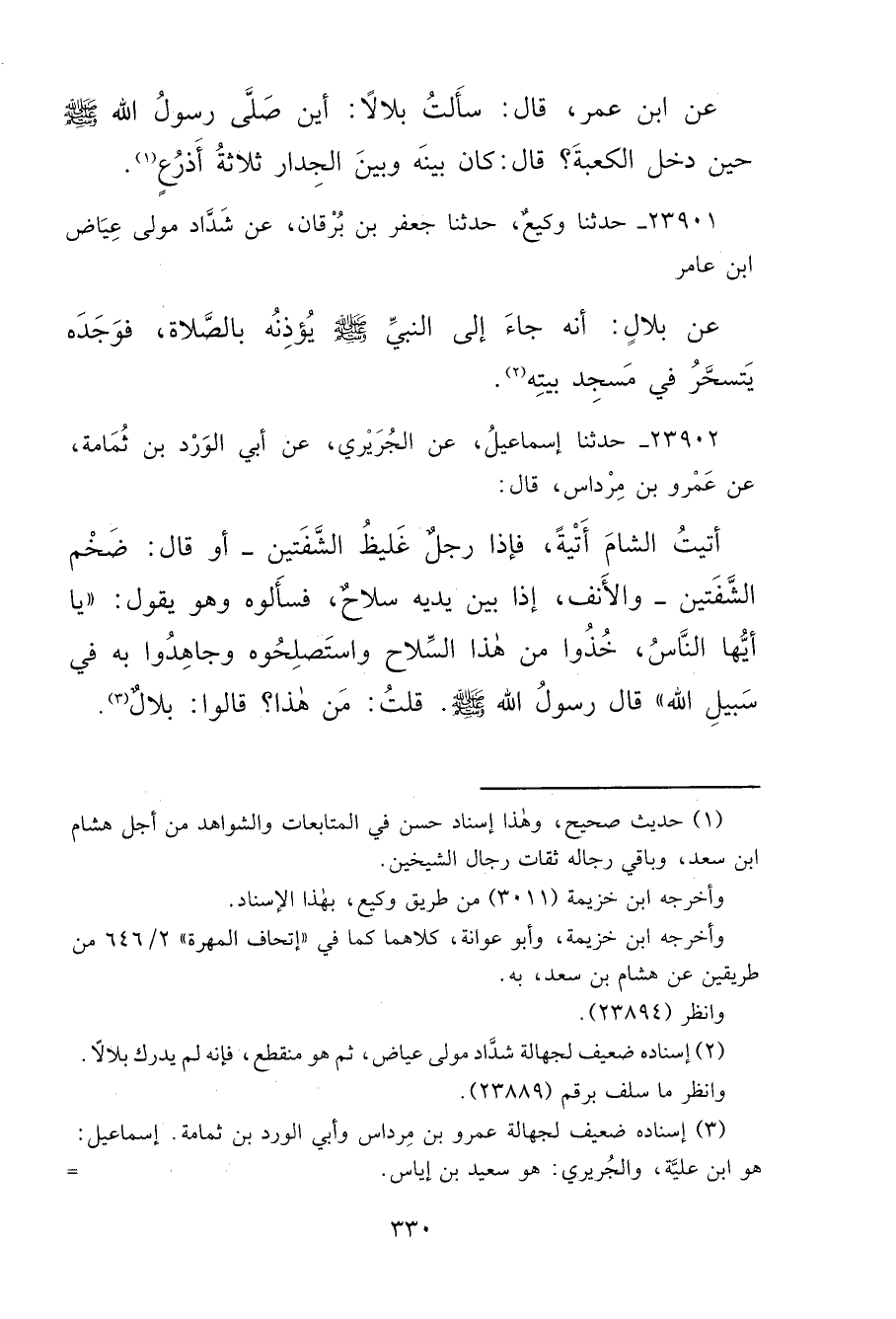 عَنِ ابْنِ عُمَرَ، قَالَ: سَأَلْتُ بِلَالًا: أَيْنَ صَلَّى رَسُولُ اللهِ صَلَّى اللهُ عَلَيْهِ وَسَلَّمَ حِينَ دَخَلَ الْكَعْبَةَ؟ قَالَ: " كَانَ بَيْنَهُ وَبَيْنَ الْجِدَارِ ثَلَاثَةُ أَذْرُعٍ " (١)