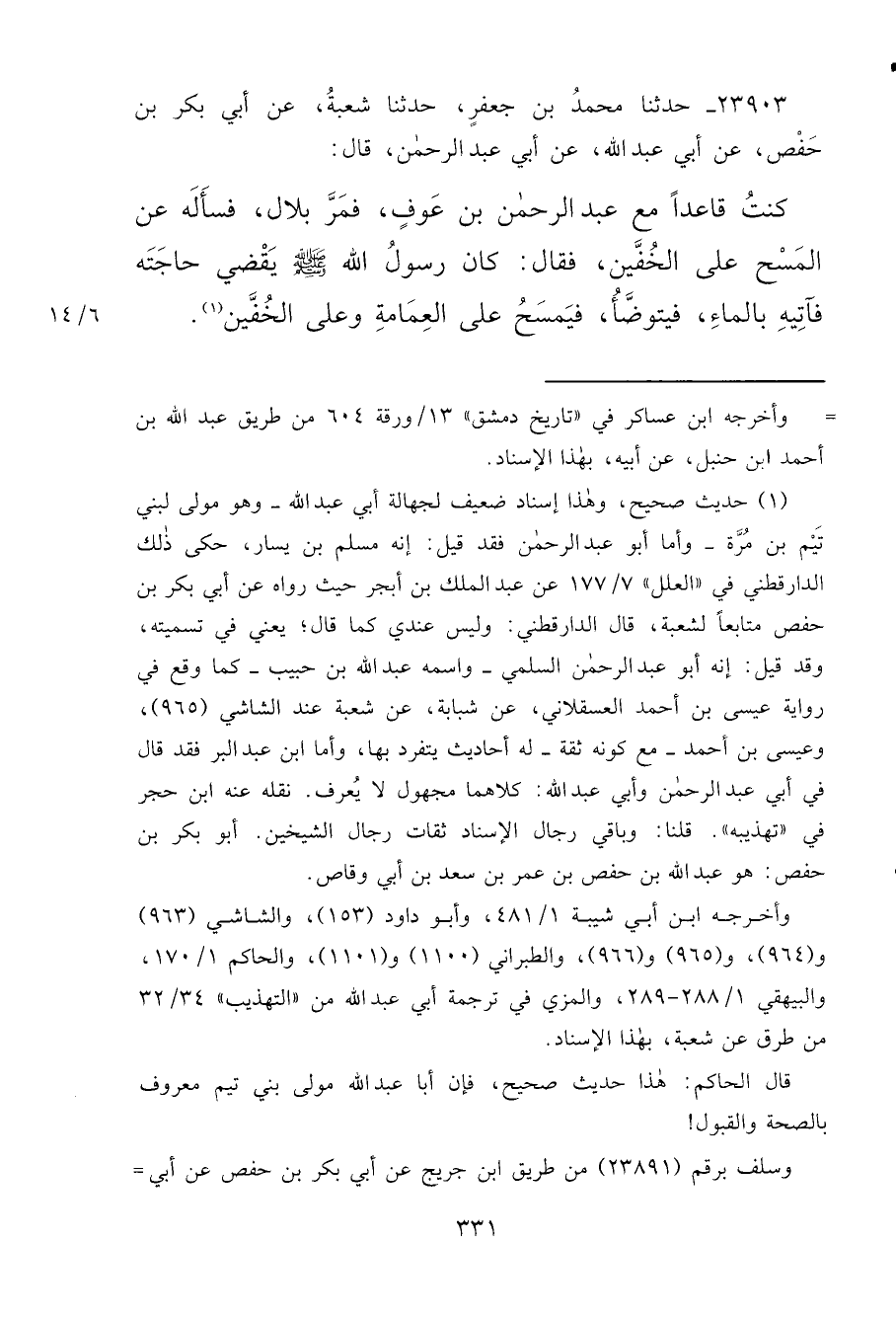 ٢٣٩٠٣ - حَدَّثَنَا مُحَمَّدُ بْنُ جَعْفَرٍ، حَدَّثَنَا شُعْبَةُ، عَنْ أَبِي بَكْرِ بْنِ حَفْصٍ، عَنْ أَبِي عَبْدِ اللهِ، عَنْ أَبِي عَبْدِ الرَّحْمَنِ، قَالَ: كُنْتُ قَاعِدًا مَعَ عَبْدِ الرَّحْمَنِ بْنِ عَوْفٍ، فَمَرَّ بِلَالٌ، فَسَأَلَهُ عَنِ الْمَسْحِ عَلَى الْخُفَّيْنِ، فَقَالَ: " كَانَ رَسُولُ اللهِ صَلَّى اللهُ عَلَيْهِ وَسَلَّمَ يَقْضِي حَاجَتَهُ، فَآتِيهِ بِالْمَاءِ، فَيَتَوَضَّأُ، وَيَمْسَحُ عَلَى الْعِمَامَةِ، وَعَلَى الْخُفَّيْنِ " (١)