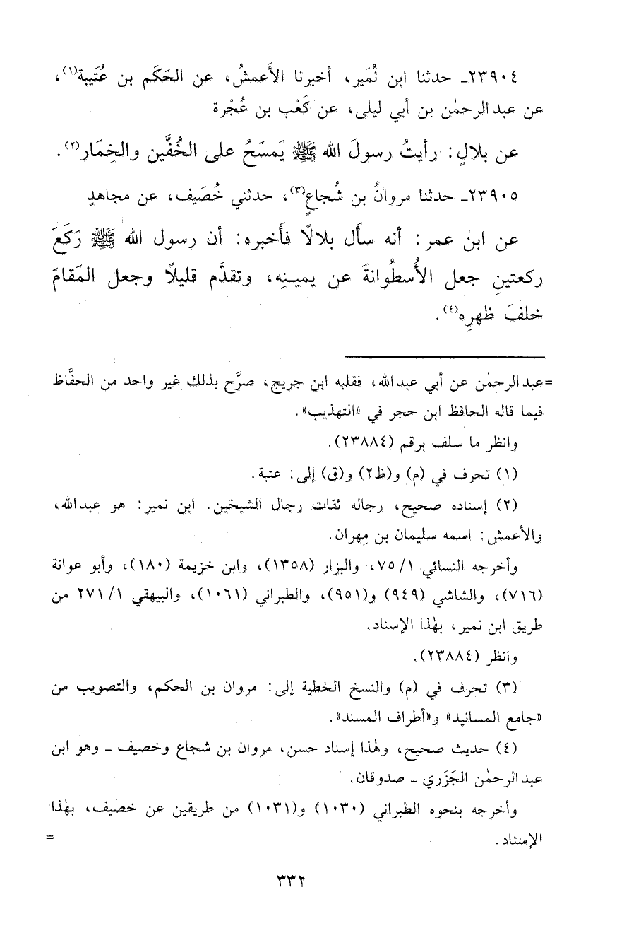 ٢٣٩٠٤ - حَدَّثَنَا ابْنُ نُمَيْرٍ، أَخْبَرَنَا الْأَعْمَشُ، عَنِ الْحَكَمِ بْنِ عُتَيْبَةَ (١) ، عَنْ عَبْدِ الرَّحْمَنِ بْنِ أَبِي لَيْلَى، عَنْ كَعْبِ بْنِ عُجْرَةَ، عَنْ بِلَالٍ: " رَأَيْتُ رَسُولَ اللهِ صَلَّى اللهُ عَلَيْهِ وَسَلَّمَ يَمْسَحُ عَلَى الْخُفَّيْنِ وَالْخِمَارِ " (٢)