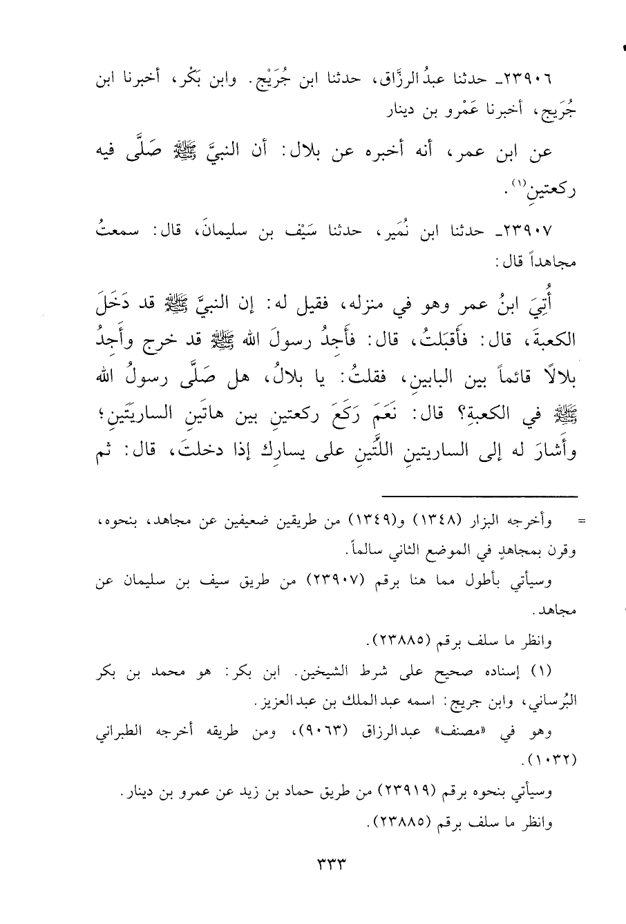 ٢٣٩٠٦ - حَدَّثَنَا عَبْدُ الرَّزَّاقِ، حَدَّثَنَا ابْنُ جُرَيْجٍ، وَابْنُ بَكْرٍ، أَخْبَرَنَا ابْنُ جُرَيْجٍ، أَخْبَرَنَا عَمْرُو بْنُ دِينَارٍ، عَنِ ابْنِ عُمَرَ، أَنَّهُ أَخْبَرَهُ عَنْ بِلَالٍ: " أَنَّ النَّبِيَّ صَلَّى اللهُ عَلَيْهِ وَسَلَّمَ صَلَّى فِيهِ رَكْعَتَيْنِ " (١)