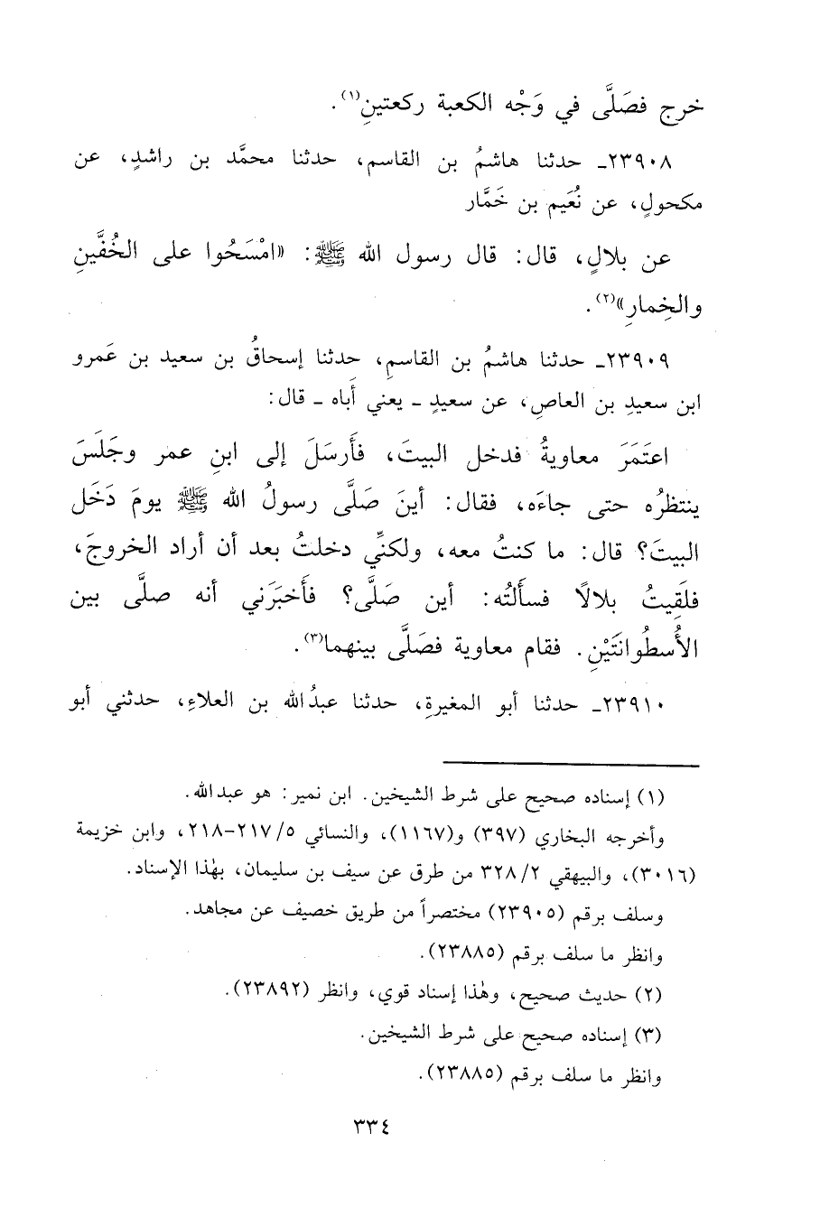 ٢٣٩٠٨ - حَدَّثَنَا هَاشِمُ بْنُ الْقَاسِمِ، حَدَّثَنَا مُحَمَّدُ بْنُ رَاشِدٍ، عَنْ مَكْحُولٍ، عَنْ نُعَيْمِ بْنِ خِمَارٍ، عَنْ بِلَالٍ، قَالَ: قَالَ رَسُولُ اللهِ صَلَّى اللهُ عَلَيْهِ وَسَلَّمَ: " امْسَحُوا عَلَى الْخُفَّيْنِ وَالْخِمَارِ " (٢)