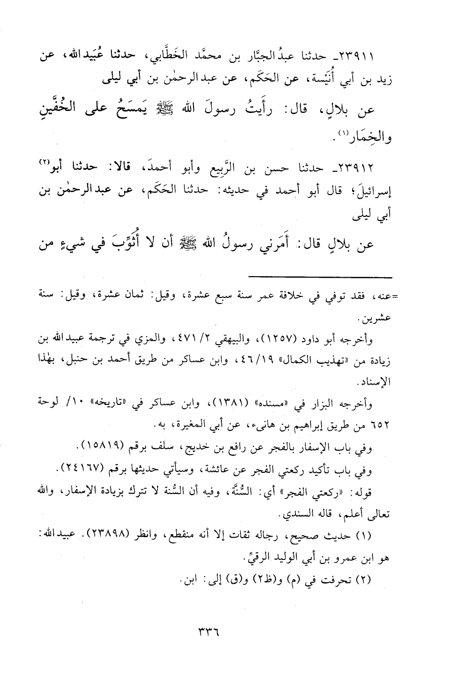 ٢٣٩١١ - حَدَّثَنَا عَبْدُ الْجَبَّارِ بْنُ مُحَمَّدٍ الْخَطَّابِيُّ، حَدَّثَنَا عُبَيْدُ اللهِ، عَنْ زَيْدِ بْنِ أَبِي أُنَيْسَةَ، عَنِ الْحَكَمِ، عَنْ عَبْدِ الرَّحْمَنِ بْنِ أَبِي لَيْلَى، عَنْ بِلَالٍ، قَالَ: وَرَأَيْتُ رَسُولَ اللهِ صَلَّى اللهُ عَلَيْهِ وَسَلَّمَ " يَمْسَحُ عَلَى الْخُفَّيْنِ وَالْخِمَارِ " (١)