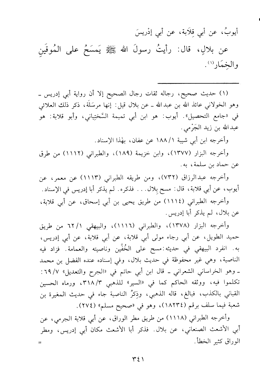 وأخرجه عبد الرزاق (٧٣٢) ، ومن طريقه الطبراني (١١١٣) عن معمر، عن أيوب، عن أبي قلابة، قال: مسح بِلال ... فذكره. لم يذكر أبا إدريس في الإسناد.