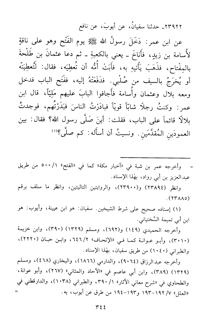٢٣٩٢٢ - حَدَّثَنَا سُفْيَانُ، عَنْ أَيُّوبَ، عَنْ نَافِعٍ، عَنِ ابْنِ عُمَرَ: دَخَلَ رَسُولُ اللهِ صَلَّى اللهُ عَلَيْهِ وَسَلَّمَ يَوْمَ الْفَتْحِ وَهُوَ عَلَى نَاقَةٍ لِأُسَامَةَ بْنِ زَيْدٍ، فَأَنَاخَ، يَعْنِي بِالْكَعْبَةِ، ثُمَّ دَعَا عُثْمَانَ بْنَ طَلْحَةَ بِالْمِفْتَاحِ، فَذَهَبَ يَأْتِيهِ بِهِ، فَأَبَتْ أُمُّهُ أَنْ تُعْطِيَهُ، فَقَالَ: لَتُعْطِيَنَّهُ أَوْ يَخْرُجُ بِالسَّيْفِ مِنْ صُلْبِي، فَدَفَعَتْهُ إِلَيْهِ، فَفَتَحَ الْبَابَ فَدَخَلَ وَمَعَهُ بِلَالٌ وَعُثْمَانُ وَأُسَامَةُ فَأَجَافُوا الْبَابَ عَلَيْهِمْ مَلِيًّا، قَالَ ابْنُ عُمَرَ: وَكُنْتُ رَجُلًا شَابًّا قَوِيًّا فَبَادَرْتُ النَّاسَ فَبَدَرْتُهُمْ، فَوَجَدْتُ بِلَالًا قَائِمًا عَلَى الْبَابِ، فَقُلْتُ: أَيْنَ صَلَّى رَسُولُ اللهِ صَلَّى اللهُ عَلَيْهِ وَسَلَّمَ؟ فَقَالَ: " بَيْنَ الْعَمُودَيْنِ الْمُقَدَّمَيْنِ "، وَنَسِيتُ أَنْ أَسْأَلَهُ كَمْ صَلَّى؟ (١)