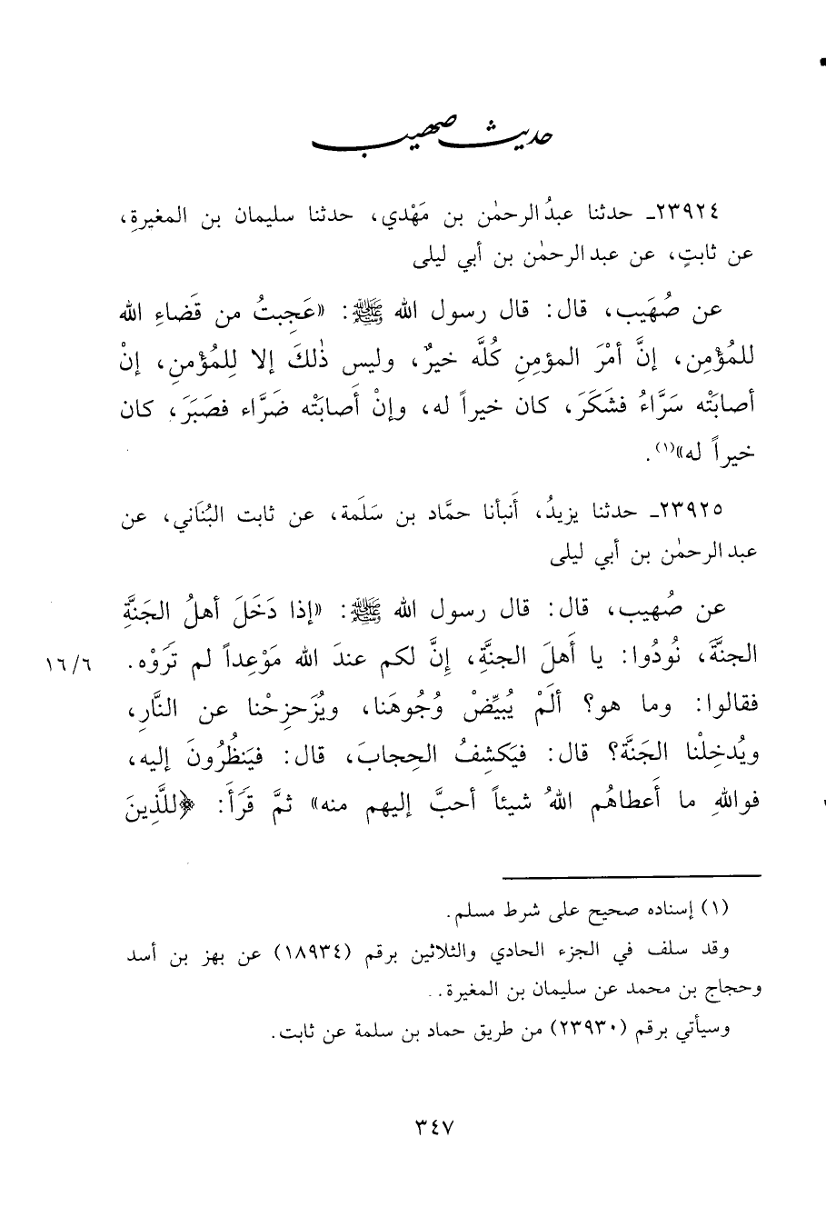 ٢٣٩٢٤ - حَدَّثَنَا عَبْدُ الرَّحْمَنِ بْنُ مَهْدِيٍّ، حَدَّثَنَا سُلَيْمَانُ بْنُ الْمُغِيرَةِ، عَنْ ثَابِتٍ، عَنْ عَبْدِ الرَّحْمَنِ بْنِ أَبِي لَيْلَى، عَنْ صُهَيْبٍ، قَالَ: قَالَ رَسُولُ اللهِ صَلَّى اللهُ عَلَيْهِ وَسَلَّمَ: " عَجِبْتُ مِنْ قَضَاءِ اللهِ لِلْمُؤْمِنِ، إِنَّ أَمْرَ الْمُؤْمِنِ كُلَّهُ خَيْرٌ، وَلَيْسَ ذَلِكَ إِلَّا لِلْمُؤْمِنِ إِنْ أَصَابَتْهُ سَرَّاءُ فَشَكَرَ، كَانَ خَيْرًا لَهُ، وَإِنْ أَصَابَتْهُ ضَرَّاءُ فَصَبَرَ، كَانَ خَيْرًا لَهُ " (١)