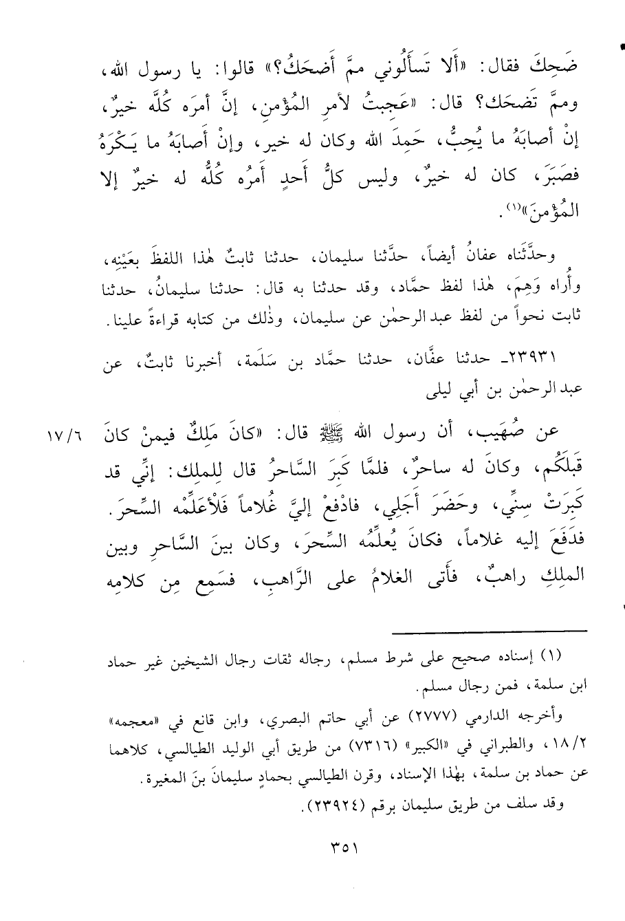 ٢٣٩٣١ - حَدَّثَنَا عَفَّانُ، حَدَّثَنَا حَمَّادُ بْنُ سَلَمَةَ، أَخْبَرَنَا ثَابِتٌ، عَنْ عَبْدِ الرَّحْمَنِ بْنِ أَبِي لَيْلَى، عَنْ صُهَيْبٍ، أَنَّ رَسُولَ اللهِ صَلَّى اللهُ عَلَيْهِ وَسَلَّمَ قَالَ: " كَانَ مَلِكٌ فِيمَنْ كَانَ قَبْلَكُمْ، وَكَانَ لَهُ سَاحِرٌ فَلَمَّا كَبِرَ السَّاحِرُ قَالَ لِلْمَلِكِ: إِنِّي قَدْ كَبِرَتْ سِنِّي، وَحَضَرَ أَجَلِي فَادْفَعْ إِلَيَّ غُلَامًا فَلَأُعَلِّمُهُ السِّحْرَ، فَدَفَعَ إِلَيْهِ غُلَامًا، فَكَانَ يُعَلِّمُهُ السِّحْرَ، وَكَانَ بَيْنَ السَّاحِرِ وَبَيْنَ الْمَلِكِ رَاهِبٌ، فَأَتَى الْغُلَامُ عَلَى الرَّاهِبِ، فَسَمِعَ مِنْ كَلَامِهِ