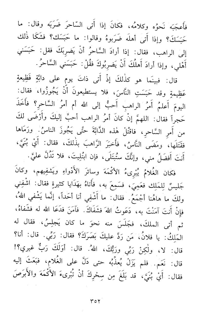 فَأَعْجَبَهُ نَحْوُهُ وَكَلَامُهُ، فَكَانَ إِذَا أَتَى السَّاحِرَ ضَرَبَهُ وَقَالَ: مَا حَبَسَكَ؟ وَإِذَا أَتَى أَهْلَهُ ضَرَبُوهُ وَقَالُوا: مَا حَبَسَكَ؟ فَشَكَا ذَلِكَ إِلَى الرَّاهِبِ فَقَالَ: إِذَا أَرَادَ السَّاحِرُ أَنْ يَضْرِبَكَ فَقُلْ: حَبَسَنِي أَهْلِي، وَإِذَا أَرَادَ أَهْلُكَ أَنْ يَضْرِبُوكَ فَقُلْ: حَبَسَنِي السَّاحِرُ، قَالَ: فَبَيْنَمَا هُوَ كَذَلِكَ إِذْ أَتَى ذَاتَ يَوْمٍ عَلَى دَابَّةٍ فَظِيعَةٍ عَظِيمَةٍ، وَقَدْ حَبَسَتِ النَّاسَ، فَلَا يَسْتَطِيعُونَ أَنْ يَجُوزُوا، فَقَالَ: الْيَوْمَ أَعْلَمُ أَمْرُ الرَّاهِبِ أَحَبُّ إِلَى اللهِ أَمْ أَمْرُ السَّاحِرِ؟ فَأَخَذَ حَجَرًا فَقَالَ: اللهُمَّ إِنْ كَانَ أَمْرُ الرَّاهِبِ أَحَبَّ إِلَيْكَ وَأَرْضَى لَكَ مِنَ أَمِرِ السَّاحِرِ، فَاقْتُلْ هَذِهِ الدَّابَّةَ حَتَّى يَجُوزَ النَّاسُ، وَرَمَاهَا فَقَتَلَهَا، وَمَضَى النَّاسُ، فَأَخْبَرَ الرَّاهِبَ بِذَلِكَ، فَقَالَ: أَيْ بُنَيَّ، أَنْتَ أَفْضَلُ مِنِّي، وَإِنَّكَ سَتُبْتَلَى، فَإِنْ ابْتُلِيتَ، فَلَا تَدُلَّ عَلَيَّ، فَكَانَ الْغُلَامُ يُبْرِئُ الْأَكْمَهَ وَسَائِرَ الْأَدْوَاءِ وَيَشْفِيهِمْ، وَكَانَ جَلِيسٌ لِلْمَلِكِ فَعَمِيَ، فَسَمِعَ بِهِ، فَأَتَاهُ بِهَدَايَا كَثِيرَةٍ فَقَالَ: اشْفِنِي وَلَكَ مَا هَاهُنَا أَجْمَعُ، فَقَالَ: مَا أَشْفِي أَنَا أَحَدًا، إِنَّمَا يَشْفِي اللهُ، فَإِنْ أَنْتَ آمَنْتَ بِهِ، دَعَوْتُ اللهَ فَشَفَاكَ، فَآمَنَ فَدَعَا اللهَ لَهُ فَشَفَاهُ، ثُمَّ أَتَى الْمَلِكَ، فَجَلَسَ مِنْهُ نَحْوَ مَا كَانَ يَجْلِسُ، فَقَالَ لَهُ الْمَلِكُ: يَا فُلَانُ، مَنْ رَدَّ عَلَيْكَ بَصَرَكَ؟ فَقَالَ: رَبِّي، قَالَ: أَنَا؟ قَالَ: لَا، وَلَكِنْ رَبِّي وَرَبُّكَ اللهُ، قَالَ: أَوَلَكَ رَبٌّ غَيْرِي؟ قَالَ: نَعَمْ. فَلَمْ يَزَلْ يُعَذِّبُهُ حَتَّى دَلَّهُ عَلَى الْغُلَامِ، فَبَعَثَ إِلَيْهِ فَقَالَ: أَيْ بُنَيَّ قَدْ بَلَغَ مِنْ سِحْرِكَ أَنْ تُبْرِئَ الْأَكْمَهَ وَالْأَبْرَصَ