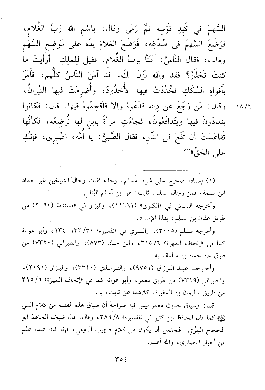 السَّهْمَ فِي كَبِدِ قَوْسِهِ ثُمَّ رَمَى فَقَالَ: بِسْمِ اللهِ رَبِّ الْغُلَامِ، فَوَضَعَ السَّهْمَ فِي صُدْغِهِ فَوَضَعَ الْغُلَامُ يَدَهُ عَلَى مَوْضِعِ السَّهْمِ وَمَاتَ فَقَالَ النَّاسُ: آمَنَّا بِرَبِّ الْغُلَامِ، فَقِيلَ لِلْمَلِكِ: أَرَأَيْتَ مَا كُنْتَ تَحْذَرُ؟ فَقَدْ وَاللهِ نَزَلَ بِكَ، قَدْ آمَنَ النَّاسُ كُلُّهُمْ، فَأَمَرَ بِأَفْوَاهِ السِّكَكِ فَخُدِّدَتْ فِيهَا الْأُخْدُودُ وَأُضْرِمَتْ فِيهَا النِّيرَانُ، وَقَالَ: مَنْ رَجَعَ عَنْ دِينِهِ فَدَعُوهُ، وَإِلَّا فَأَقْحِمُوهُ فِيهَا، قَالَ: فَكَانُوا يَتَعَادَوْنَ فِيهَا وَيَتَدَافَعُونَ، فَجَاءَتْ امْرَأَةٌ بِابْنٍ لَهَا تُرْضِعُهُ، فَكَأَنَّهَا تَقَاعَسَتْ أَنْ تَقَعَ فِي النَّارِ، فَقَالَ الصَّبِيُّ: يَا أُمَّهْ، اصْبِرِي، فَإِنَّكِ عَلَى الْحَقِّ " (١)