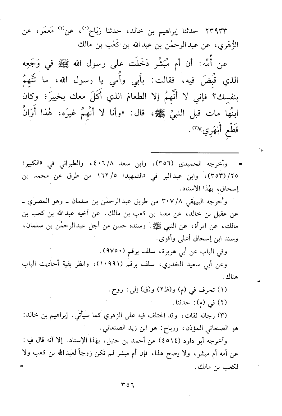 ٢٣٩٣٣ - حَدَّثَنَا إِبْرَاهِيمُ بْنُ خَالِدٍ، حَدَّثَنَا رَبَاحٌ (١) ، عَنْ (٢) مَعْمَرٌ، عَنِ الزُّهْرِيِّ، عَنْ عَبْدِ الرَّحْمَنِ بْنِ عَبْدِ اللهِ بْنِ كَعْبِ بْنِ مَالِكٍ، عَنْ أُمِّهِ، أَنَّ أُمَّ مُبَشِّرٍ دَخَلَتْ عَلَى رَسُولِ اللهِ صَلَّى اللهُ عَلَيْهِ وَسَلَّمَ فِي وَجَعِهِ الَّذِي قُبِضَ فِيهِ، فَقَالَتْ: بِأَبِي وَأُمِّي يَا رَسُولَ اللهِ، مَا تَتَّهِمُ بِنَفْسِكَ؟ فَإِنِّي لَا أَتَّهِمُ إِلَّا الطَّعَامَ الَّذِي أَكَلَ مَعَكَ بِخَيْبَرَ، وَكَانَ ابْنُهَا مَاتَ قَبْلَ النَّبِيِّ صَلَّى اللهُ عَلَيْهِ وَسَلَّمَ قَالَ: " وَأَنَا لَا أَتَّهِمُ غَيْرَهُ، هَذَا أَوَانُ قَطْعِ أَبْهَرِي " (٣)