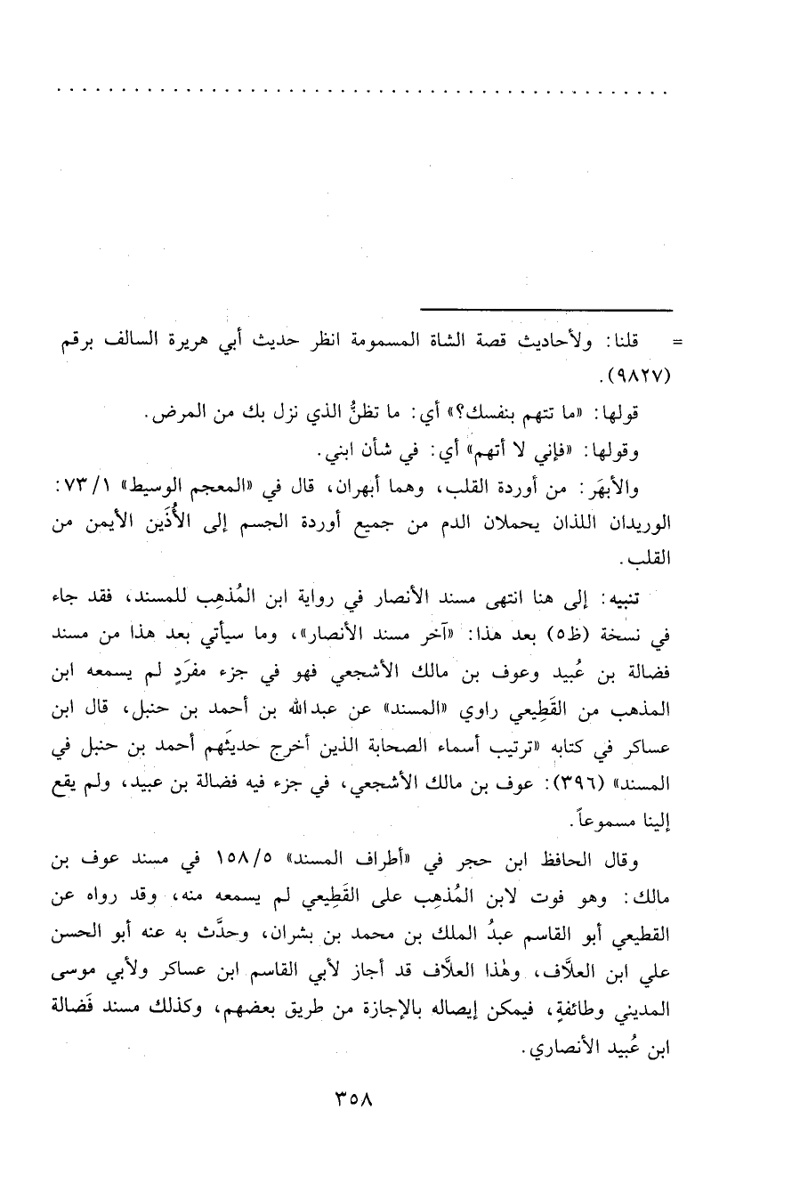 وقال الحافظ ابن حجر في "أطراف المسند" ٥/١٥٨ في مسند عوف بن مالك: وهو فوت لابن المُذهِب على القَطِيعي لم يسمعه منه، وقد رواه عن القطيعي أبو القاسم عبدُ الملك بن محمد بن بشران، وحدَّث به عنه أبو الحسن علي ابن العلَاّف، وهذا العلَاّف قد أجاز لأبي القاسم ابن عساكر ولأبي موسى المديني وطائفةٍ، فيمكن إيصاله بالإجازة من طريق بعضهم، وكذلك مسند فَضالة ابن عُبيد الأنصاري.