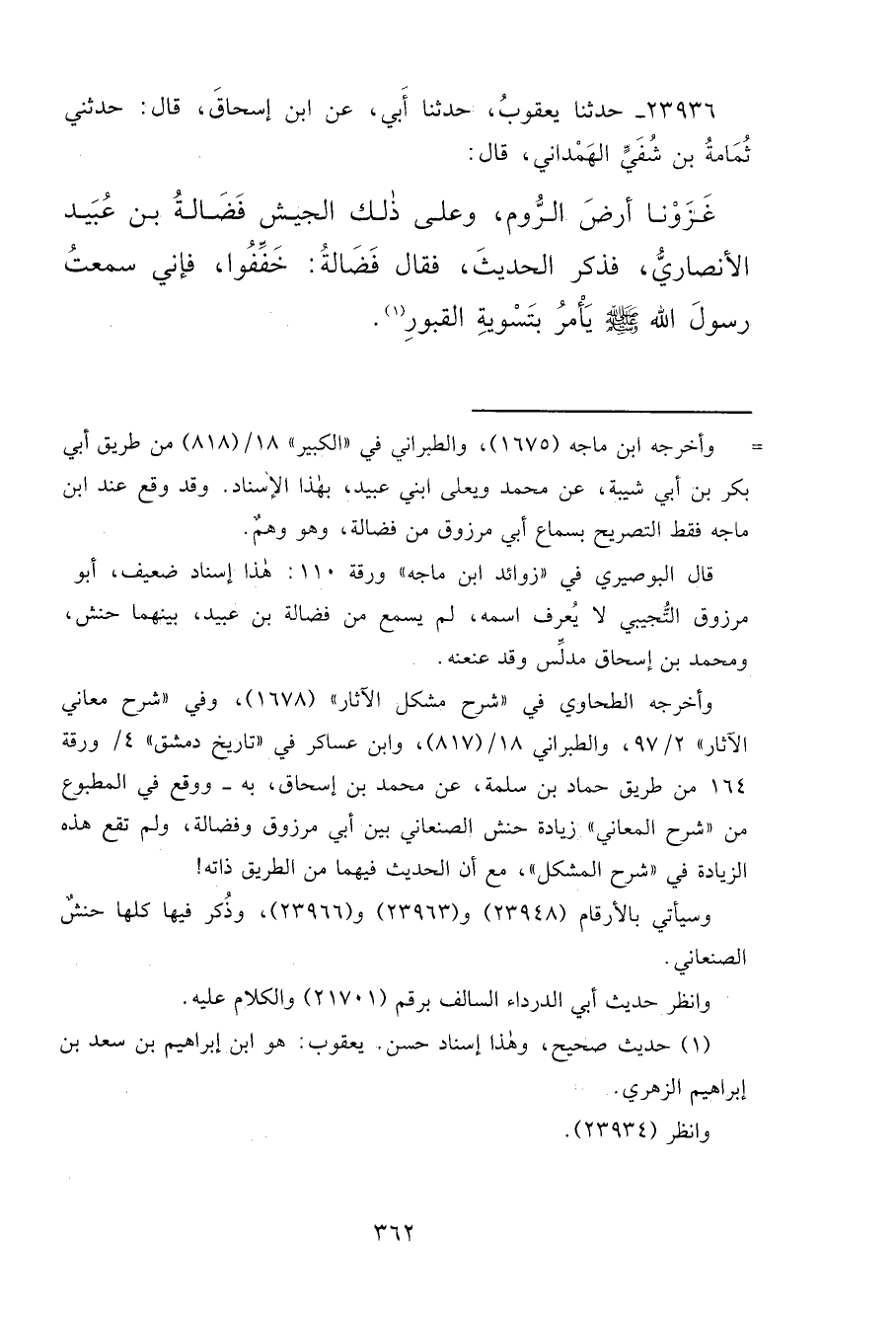 ٢٣٩٣٦ - حَدَّثَنَا يَعْقُوبُ، حَدَّثَنَا أَبِي، عَنِ ابْنِ إِسْحَاقَ، قَالَ: حَدَّثَنِي ثُمَامَةُ بْنُ شُفَيٍّ الْهَمْدَانِيُّ، قَالَ: غَزَوْنَا أَرْضَ الرُّومِ وَعَلَى ذَلِكَ الْجَيْشِ فَضَالَةُ بْنُ عُبَيْدٍ الْأَنْصَارِيُّ فَذَكَرَ الْحَدِيثَ فَقَالَ فَضَالَةُ: خَفِّفُوا، فَإِنِّي سَمِعْتُ رَسُولَ اللهِ صَلَّى اللهُ عَلَيْهِ وَسَلَّمَ " يَأْمُرُ بِتَسْوِيَةِ الْقُبُورِ " (١)