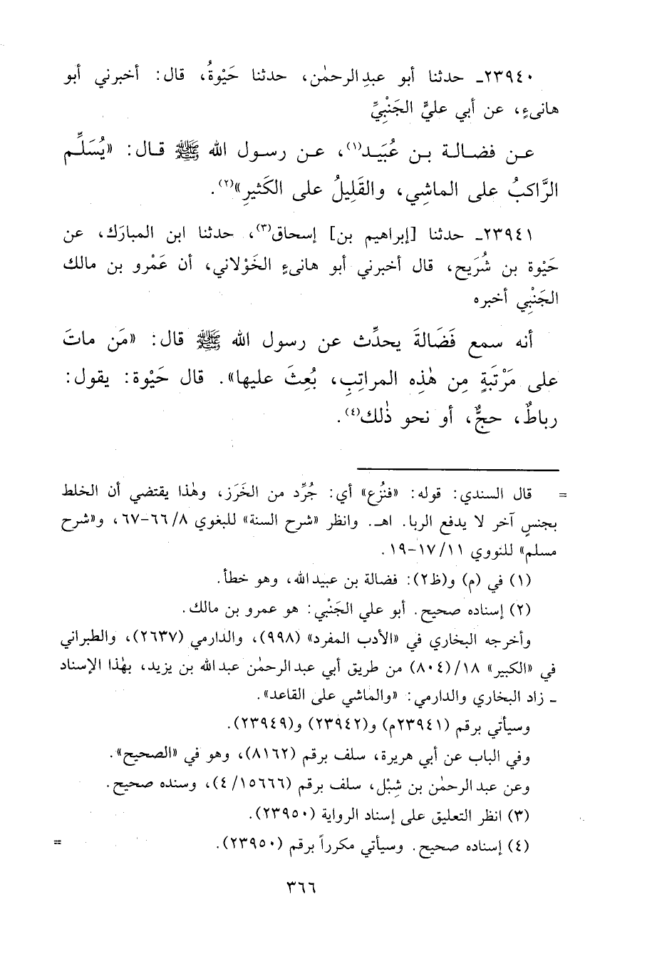 ٢٣٩٤٠ - حَدَّثَنَا أَبُو عَبْدِ الرَّحْمَنِ، حَدَّثَنَا حَيْوَةُ، قَالَ: أَخْبَرَنِي أَبُو هَانِئٍ، عَنْ أَبِي عَلِيٍّ الْجَنْبِيِّ، عَنْ فَضَالَةَ بْنِ عُبَيْدِ (١) ، عَنْ رَسُولِ اللهِ صَلَّى اللهُ عَلَيْهِ وَسَلَّمَ قَالَ: " يُسَلِّمُ الرَّاكِبُ عَلَى الْمَاشِي وَالْقَلِيلُ عَلَى الْكَثِيرِ " (٢)