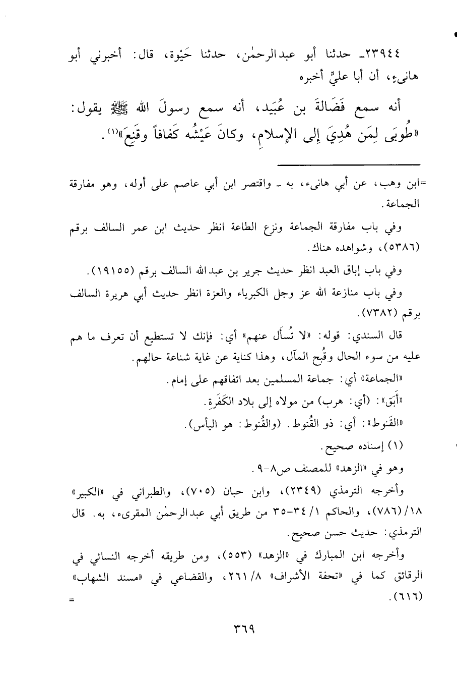 ٢٣٩٤٤ - حَدَّثَنَا أَبُو عَبْدِ الرَّحْمَنِ، حَدَّثَنَا حَيْوَةُ، قَالَ: أَخْبَرَنِي أَبُو هَانِئٍ، أَنَّ أَبَا عَلِيٍّ، أَخْبَرَهُ أَنَّهُ، سَمِعَ فَضَالَةَ بْنَ عُبَيْدٍ، أَنَّهُ سَمِعَ رَسُولَ اللهِ صَلَّى اللهُ عَلَيْهِ وَسَلَّمَ يَقُولُ: " طُوبَى لِمَنْ هُدِيَ إِلَى الْإِسْلَامِ، وَكَانَ عَيْشُهُ كَفَافًا وَقَنَعَ " (١)
