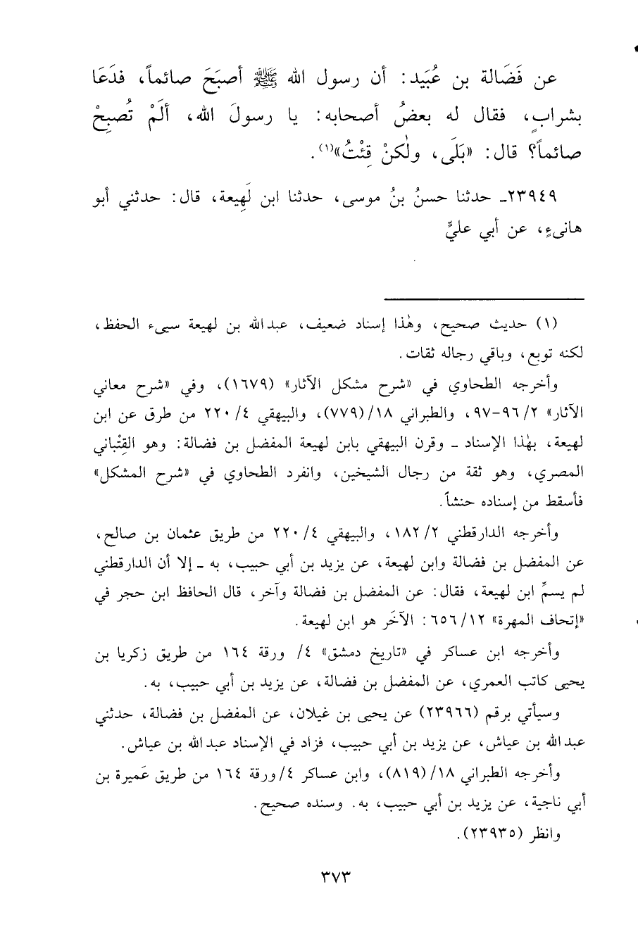 ٢٣٩٤٩ - حَدَّثَنَا حَسَنُ بْنُ مُوسَى، حَدَّثَنَا ابْنُ لَهِيعَةَ، قَالَ: حَدَّثَنِي أَبُو هَانِئٍ، عَنْ أَبِي عَلِيٍّ،