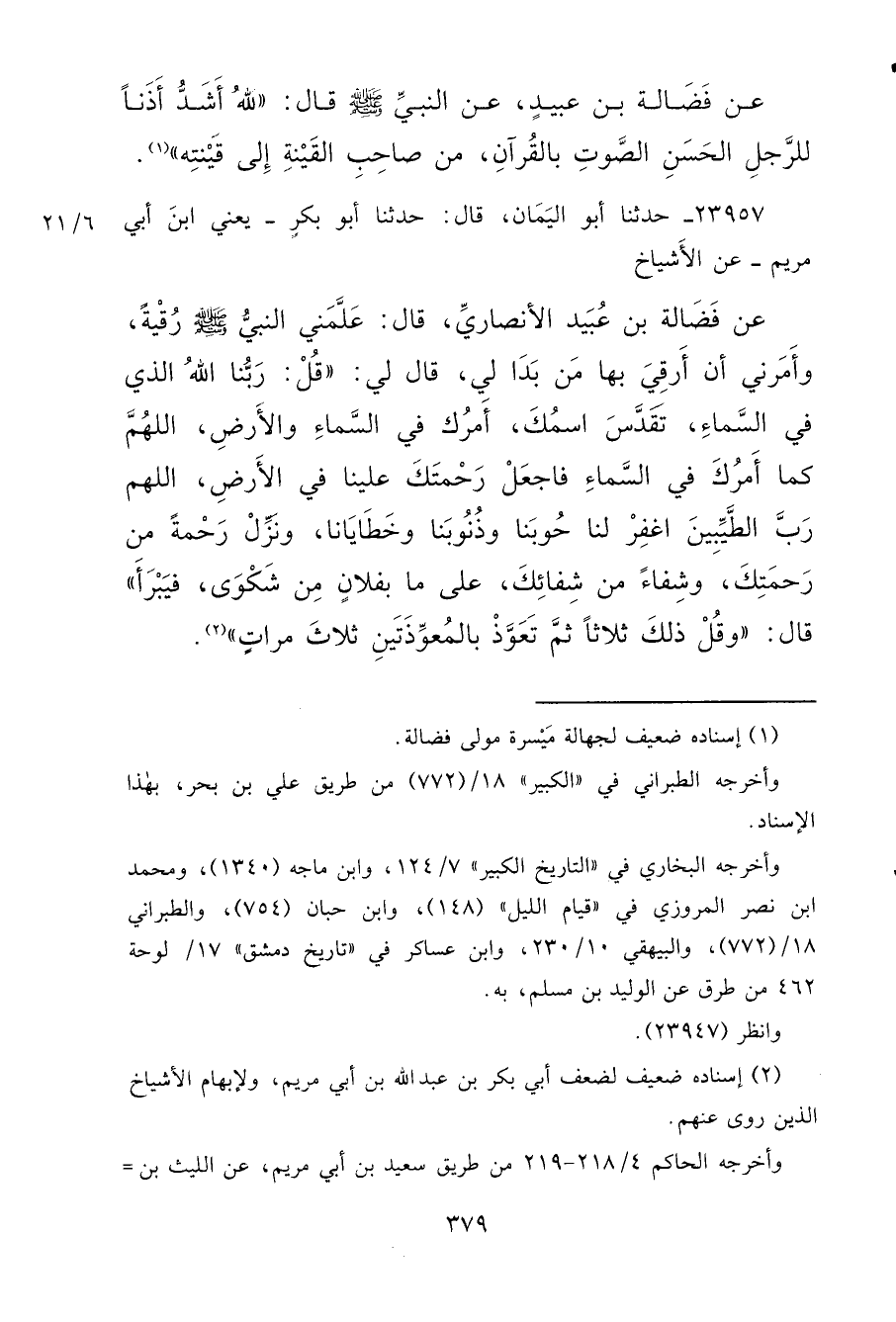 ٢٣٩٥٧ - حَدَّثَنَا أَبُو الْيَمَانِ، قَالَ: حَدَّثَنَا أَبُو بَكْرٍ يَعْنِي ابْنَ أَبِي مَرْيَمَ، عَنِ الْأَشْيَاخِ، عَنْ فَضَالَةَ بْنِ عُبَيْدٍ الْأَنْصَارِيِّ، قَالَ: عَلَّمَنِي النَّبِيُّ صَلَّى اللهُ عَلَيْهِ وَسَلَّمَ رُقْيَةً، وَأَمَرَنِي أَنْ أَرْقِيَ بِهَا مَنْ بَدَا لِي، قَالَ لِي: " قُلْ: رَبَّنَا اللهُ الَّذِي فِي السَّمَوَاتِ، تَقَدَّسَ اسْمُكَ، أَمْرُكَ فِي السَّمَاءِ وَالْأَرْضِ، اللهُمَّ كَمَا أَمْرُكَ فِي السَّمَاءِ فَاجْعَلْ رَحْمَتَكَ عَلَيْنَا فِي الْأَرْضِ، اللهُمَّ رَبَّ الطَّيِّبِينَ اغْفِرْ لَنَا حَوْبَنَا وَذُنُوبَنَا وَخَطَايَانَا، وَنَزِّلْ رَحْمَةً مِنْ رَحْمَتِكَ، وَشِفَاءً مِنْ شِفَائِكَ، عَلَى مَا بِفُلَانٍ مِنْ شَكْوَى، فَيَبْرَأُ " قَالَ: " وَقُلْ ذَلِكَ ثَلَاثًا، ثُمَّ تَعَوَّذْ بِالْمُعَوِّذَتَيْنِ ثَلَاثَ مَرَّاتٍ " (٢)