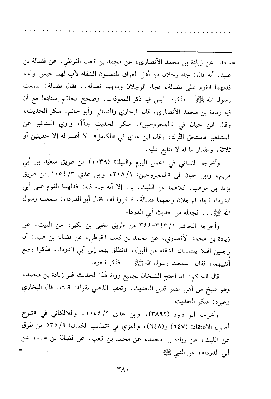= سعد، عن زيادة بن محمد الأنصاري، عن محمد بن كعب القرظي، عن فضالة بن عبيد، أنه قال: جاء رجلان من أهل العراق يلتمسون الشفاء لأب لهما حبس بوله، فدلهما القوم على فضالة، فجاء الرجلان ومعهما فضالة.. فقال فضالة: سمعت رسول الله صَلَّى اللهُ عَلَيْهِ وَسَلَّمَ.. فذكره. ليس فيه ذكر المعوذات. وصحح الحاكم إسناده! مع أن فيه زيادة بن محمد الأنصاري، قال البخاري والنسائي وأبو حاتم: منكر الحديث، وقال ابن حبان في "المجروحين": منكر الحديث جدّاً، يروي المناكير عن
