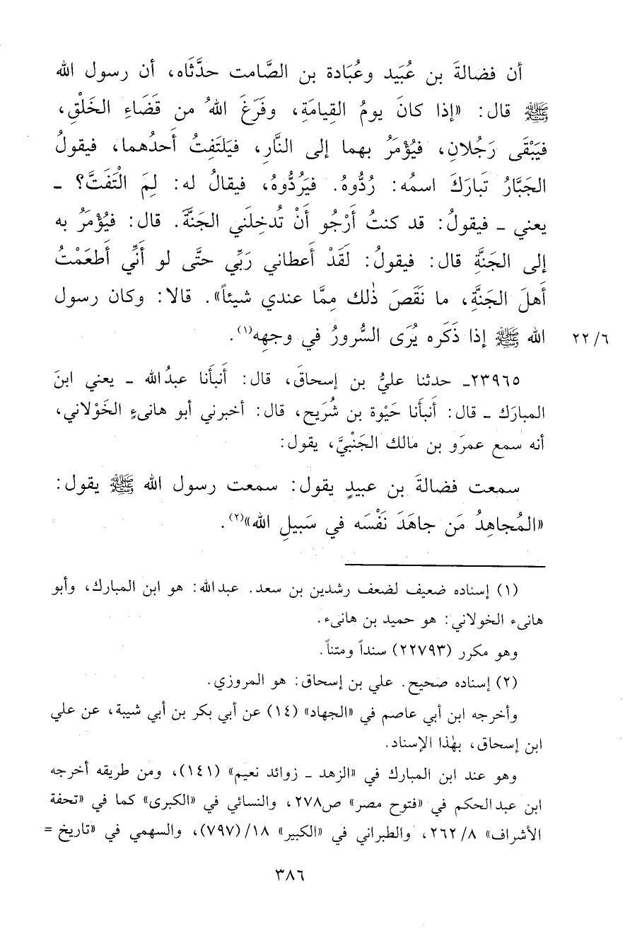 ٢٣٩٦٥ - حَدَّثَنَا عَلِيُّ بْنُ إِسْحَاقَ، قَالَ: أَنْبَأَنَا عَبْدُ اللهِ يَعْنِي ابْنَ الْمُبَارَكِ، قَالَ: أَنْبَأَنَا حَيْوَةُ بْنُ شُرَيْحٍ، قَالَ: أَخْبَرَنِي أَبُو هَانِئٍ الْخَوْلَانِيُّ، أَنَّهُ سَمِعَ عَمْرَو بْنَ مَالِكٍ الْجَنْبِيَّ، يَقُولُ: سَمِعْتُ فَضَالَةَ بْنَ عُبَيْدٍ، يَقُولُ: سَمِعْتُ رَسُولَ اللهِ صَلَّى اللهُ عَلَيْهِ وَسَلَّمَ يَقُولُ: " الْمُجَاهِدُ مَنْ جَاهَدَ نَفْسَهُ فِي سَبِيلِ اللهِ " (٢)