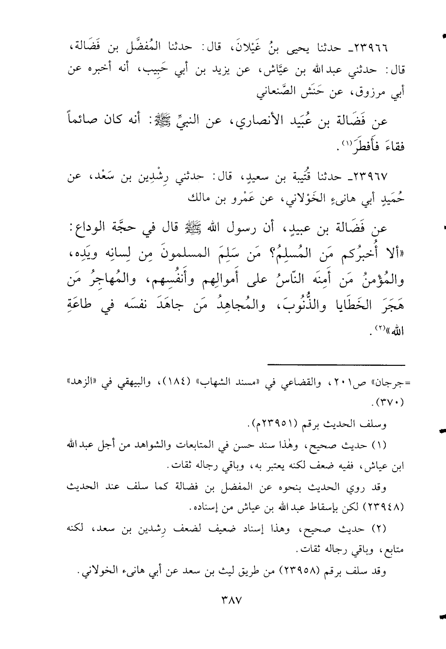 ٢٣٩٦٧ - حَدَّثَنَا قُتَيْبَةُ بْنُ سَعِيدٍ، قَالَ: حَدَّثَنِي رِشْدِينُ بْنُ سَعْدٍ، عَنْ حُمَيْدٍ أَبِي هَانِئٍ الْخَوْلَانِيِّ، عَنْ عَمْرِو بْنِ مَالِكٍ، عَنْ فَضَالَةَ بْنِ عُبَيْدٍ، أَنَّ رَسُولَ اللهِ صَلَّى اللهُ عَلَيْهِ وَسَلَّمَ قَالَ فِي حَجَّةِ الْوَدَاعِ: " أَلَا أُخْبِرُكُمْ مَنِ الْمُسْلِمُ؟ مَنْ سَلِمَ الْمُسْلِمُونَ مِنْ لِسَانِهِ وَيَدِهِ، وَالْمُؤْمِنُ مَنْ أَمِنَهُ النَّاسُ عَلَى أَمْوَالِهِمْ وَأَنْفُسِهِمْ، وَالْمُهَاجِرُ مَنْ هَجَرَ الْخَطَايَا وَالذَّنُوبَ، وَالْمُجَاهِدُ مَنْ جَاهَدَ نَفْسَهُ فِي طَاعَةِ اللهِ " (٢)