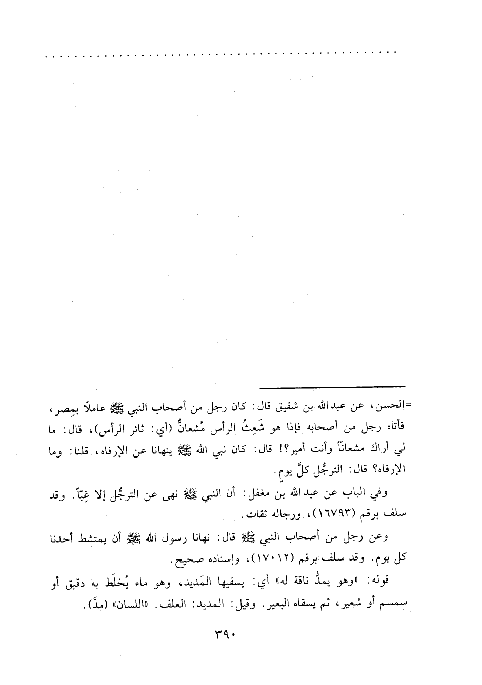 = الحسن، عن عبد الله بن شقيق قال: كان رجل من أصحاب النبي صَلَّى اللهُ عَلَيْهِ وَسَلَّمَ عاملاً بمِصر، فأتاه رجل من أصحابه فإذا هو شَعِثُ الرأس مُشعانٌّ (أي: ثائر الرأس) ، قال: ما لي أراك مشعانّاً وأنت أمير؟! قال: كان نبي الله صَلَّى اللهُ عَلَيْهِ وَسَلَّمَ ينهانا عن الإرفاه، قلنا: وما الإرفاه؟ قال: الترجُّل كلَّ يومٍ.