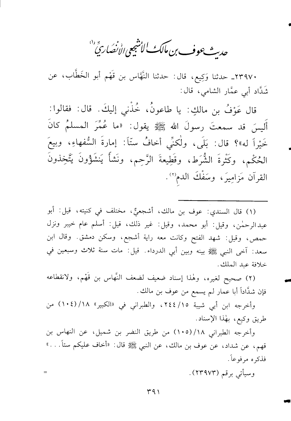 حَدِيثُ عَوْفِ بْنِ مَالِكٍ الْأَشْجَعِيِّ الْأَنْصَارِيِّ (١)