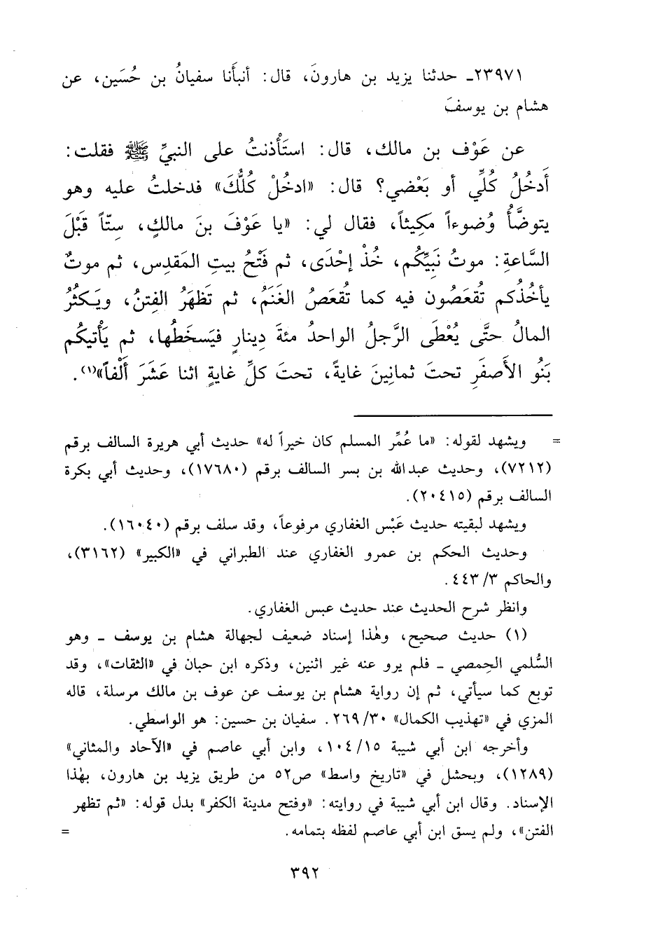 ٢٣٩٧١ - حَدَّثَنَا يَزِيدُ بْنُ هَارُونَ، قَالَ: أَنْبَأَنَا سُفْيَانُ بْنُ حُسَيْنٍ، عَنْ هِشَامِ بْنِ يُوسُفَ، عَنْ عَوْفِ بْنِ مَالِكٍ، قَالَ: اسْتَأْذَنْتُ عَلَى النَّبِيِّ صَلَّى اللهُ عَلَيْهِ وَسَلَّمَ فَقُلْتُ: أَدْخُلُ كُلِّي أَوْ بَعْضِي؟ قَالَ: " ادْخُلْ كُلُّكَ " فَدَخَلْتُ عَلَيْهِ وَهُوَ يَتَوَضَّأُ وُضُوءًا مَكِيثًا، فَقَالَ لِي: " يَا عَوْفُ بْنَ مَالِكٍ، سِتًّا قَبْلَ السَّاعَةِ: مَوْتُ نَبِيِّكُمْ خُذْ إِحْدَى، ثُمَّ فَتْحُ بَيْتِ الْمَقْدِسِ، ثُمَّ مَوْتٌ يَأْخُذُكُمْ تُقْعَصُونَ فِيهِ كَمَا تُقْعَصُ الْغَنَمُ، ثُمَّ تَظْهَرُ الْفِتَنُ، وَيَكْثُرُ الْمَالُ حَتَّى يُعْطَى الرَّجُلُ الْوَاحِدُ مِائَةَ دِينَارٍ فَيَسْخَطَهَا، ثُمَّ يَأْتِيكُمْ بَنُو الْأَصْفَرِ تَحْتَ ثَمَانِينَ غَايَةً تَحْتَ كُلِّ غَايَةٍ اثْنَا عَشَرَ أَلْفًا " (١)