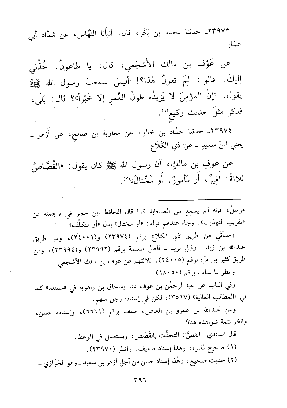 ٢٣٩٧٤ - حَدَّثَنَا حَمَّادُ بْنُ خَالِدٍ، عَنْ مُعَاوِيَةَ بْنِ صَالِحٍ، عَنْ أَزْهَرَ يَعْنِي ابْنَ سَعِيدٍ، عَنْ ذِي الْكَلَاعِ، عَنْ عَوْفِ بْنِ مَالِكٍ، أَنَّ رَسُولَ اللهِ صَلَّى اللهُ عَلَيْهِ وَسَلَّمَ كَانَ يَقُولُ: " الْقُصَّاصُ ثَلَاثَةٌ: أَمِيرٌ، أَوْ مَأْمُورٌ، أَوْ مُخْتَالٌ " (٢)