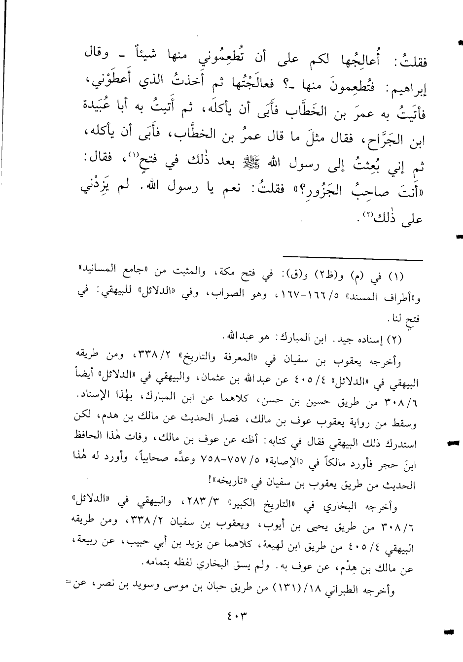 فَقُلْتُ: أُعَالِجُهَا لَكُمْ عَلَى أَنْ تُطْعِمُونِي مِنْهَا شَيْئًا، وَقَالَ إِبْرَاهِيمُ: فَتُطْعِمُونِي مِنْهَا؟، فَعَالَجْتُهَا، ثُمَّ أَخَذْتُ الَّذِي أَعْطَوْنِي، فَأَتَيْتُ بِهِ عُمَرَ بْنَ الْخَطَّابِ فَأَبَى أَنْ يَأْكُلَهُ ثُمَّ أَتَيْتُ بِهِ أَبَا عُبَيْدَةَ بْنَ الْجَرَّاحِ، فَقَالَ مِثْلَ مَا قَالَ عُمَرُ بْنُ الْخَطَّابِ، فَأَبَى أَنْ يَأْكُلَهُ، ثُمَّ إِنِّي بُعِثْتُ إِلَى رَسُولِ اللهِ صَلَّى اللهُ عَلَيْهِ وَسَلَّمَ بَعْدَ ذَلكَ فِي فَتْحٍ (١) فَقَالَ: " أَنْتَ صَاحِبُ الْجَزُورِ؟ " فَقُلْتُ: نَعَمْ يَا رَسُولَ اللهِ لَمْ يَزِدْنِي عَلَى ذَلِكَ (٢)