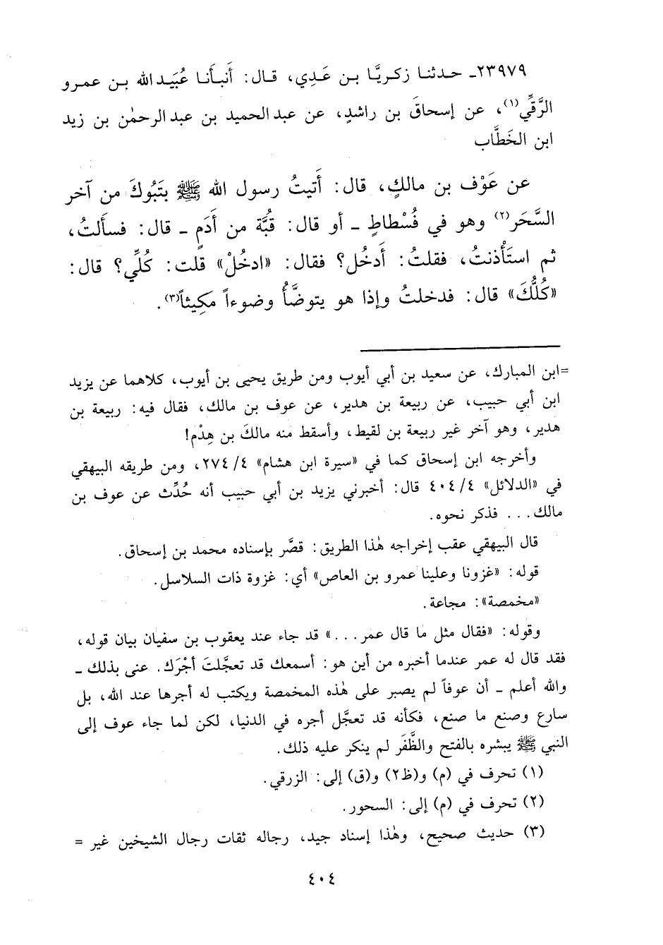 ٢٣٩٧٩ - حَدَّثَنَا زَكَرِيَّا بْنُ عَدِيٍّ، قَالَ: أَنْبَأَنَا عُبَيْدُ اللهِ بْنُ عَمْرٍو الرُّقِّيُّ (١) ، عَنْ إِسْحَاقَ بْنِ رَاشِدٍ، عَنْ عَبْدِ الْحَمِيدِ بْنِ عَبْدِ الرَّحْمَنِ بْنِ زَيْدِ بْنِ الْخَطَّابِ، عَنْ عَوْفِ بْنِ مَالِكٍ، قَالَ: أَتَيْتُ رَسُولَ اللهِ صَلَّى اللهُ عَلَيْهِ وَسَلَّمَ بِتَبُوكَ مِنْ آخِرِ السَّحَرِ (٢) وَهُوَ فِي فُسْطَاطٍ، أَوْ قَالَ: قُبَّةٍ مِنْ أَدَمٍ، قَالَ: فَسَأَلْتُ، ثُمَّ اسْتَأْذَنْتُ فَقُلْتُ: أَدْخُلُ؟ فَقَالَ: " ادْخُلْ " قُلْتُ: كُلِّي؟ قَالَ: " كُلُّكَ " قَالَ: فَدَخَلْتُ وَإِذَا هُوَ يَتَوَضَّأُ وُضُوءًا مَكِيثًا (٣)