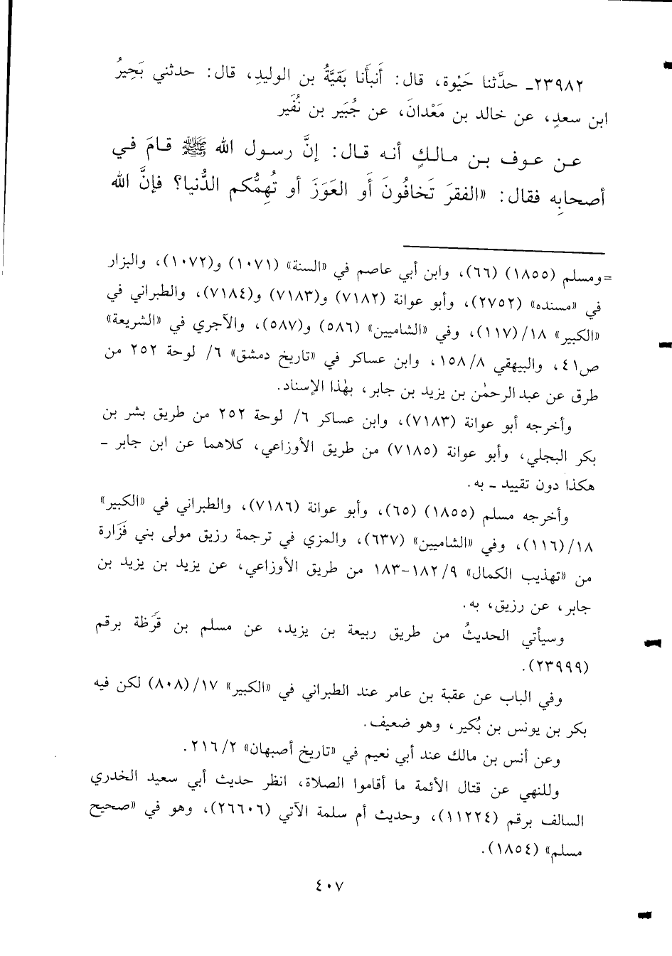 ٢٣٩٨٢ - حَدَّثَنَا حَيْوَةُ، قَالَ: أَنْبَأَنَا بَقِيَّةُ بْنُ الْوَلِيدِ، قَالَ: حَدَّثَنِي بَحِيرُ بْنُ سَعْدٍ، عَنْ خَالِدِ بْنِ مَعْدَانَ، عَنْ جُبَيْرِ بْنِ نُفَيْرٍ، عَنْ عَوْفِ بْنِ مَالِكٍ، أَنَّهُ قَالَ: إِنَّ رَسُولَ اللهِ صَلَّى اللهُ عَلَيْهِ وَسَلَّمَ قَامَ فِي أَصْحَابِهِ فَقَالَ: " الْفَقْرَ تَخَافُونَ، أَوِ الْعَوَزَ، أَوَ تُهِمُّكُمُ الدُّنْيَا؟ فَإِنَّ اللهَ