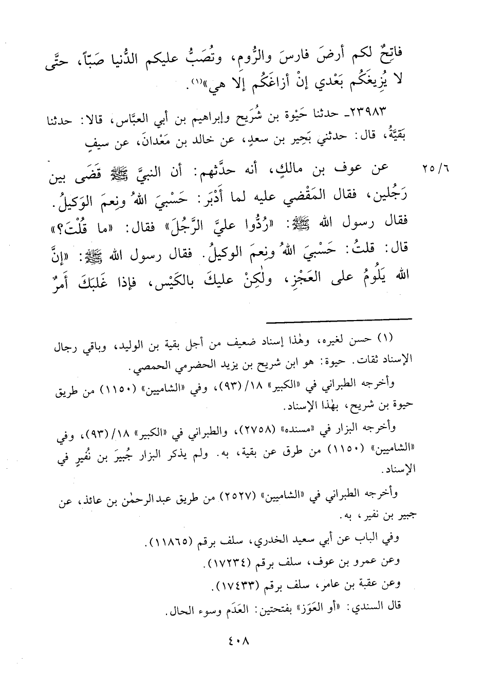 ٢٣٩٨٣ - حَدَّثَنَا حَيْوَةُ بْنُ شُرَيْحٍ، وَإِبْرَاهِيمُ بْنُ أَبِي الْعَبَّاسِ، قَالَا: حَدَّثَنَا بَقِيَّةُ، قَالَ: حَدَّثَنِي بَحِيرُ بْنُ سَعْدٍ، عَنْ خَالِدِ بْنِ مَعْدَانَ، عَنْ سَيْفٍ، عَنْ عَوْفِ بْنِ مَالِكٍ، أَنَّهُ حَدَّثَهُمْ: أَنَّ النَّبِيَّ صَلَّى اللهُ عَلَيْهِ وَسَلَّمَ قَضَى بَيْنَ رَجُلَيْنِ، فَقَالَ الْمَقْضِيُّ عَلَيْهِ لَمَّا أَدْبَرَ: حَسْبِيَ اللهُ وَنِعْمَ الْوَكِيلُ، فَقَالَ رَسُولُ اللهِ صَلَّى اللهُ عَلَيْهِ وَسَلَّمَ: " رُدُّوا عَلَيَّ الرَّجُلَ " فَقَالَ: " مَا قُلْتَ؟ ": قَالَ: قُلْتُ: حَسْبِيَ اللهُ وَنِعْمَ الْوَكِيلُ، فَقَالَ رَسُولُ اللهِ صَلَّى اللهُ عَلَيْهِ وَسَلَّمَ: " إِنَّ اللهَ يَلُومُ عَلَى الْعَجْزِ، وَلَكِنْ عَلَيْكَ بِالْكَيْسِ، فَإِذَا غَلَبَكَ أَمْرٌ