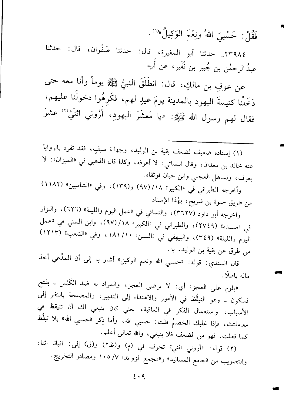 ٢٣٩٨٤ - حَدَّثَنَا أَبُو الْمُغِيرَةِ قَالَ: حَدَّثَنَا صَفْوَانُ قَالَ: حَدَّثَنَا عَبْدُ الرَّحْمَنِ بْنُ جُبَيْرِ بْنِ نُفَيْرٍ، عَنْ أَبِيهِ، عَنْ عَوْفِ بْنِ مَالِكٍ قَالَ: انْطَلَقَ النَّبِيُّ صَلَّى اللهُ عَلَيْهِ وَسَلَّمَ يَوْمًا وَأَنَا مَعَهُ حَتَّى دَخَلْنَا كَنِيسَةَ الْيَهُودِ بِالْمَدِينَةِ، يَوْمَ عِيدٍ لَهُمْ، فَكَرِهُوا دُخُولَنَا عَلَيْهِمْ، فَقَالَ لَهُمْ رَسُولُ اللهِ صَلَّى اللهُ عَلَيْهِ وَسَلَّمَ: " يَا مَعْشَرَ الْيَهُودِ أَرُونِي اثْنَيْ (٢) عَشَرَ