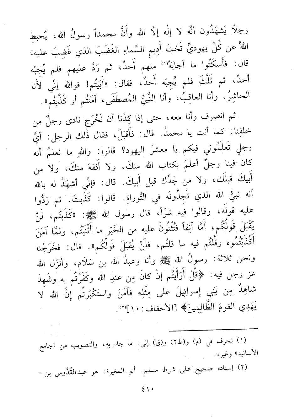 رَجُلًا يَشْهَدُونَ أَنَّهُ لَا إِلَهَ إِلَّا اللهُ، وَأَنَّ مُحَمَّدًا رَسُولُ اللهِ، يُحْبِطِ اللهُ عَنْ كُلِّ يَهُودِيٍّ تَحْتَ أَدِيمِ السَّمَاءِ الْغَضَبَ، الَّذِي غَضِبَ عَلَيْهِ " قَالَ: فَأَسْكَتُوا مَا أَجَابَهُ (١) مِنْهُمْ أَحَدٌ، ثُمَّ رَدَّ عَلَيْهِمْ فَلَمْ يُجِبْهُ أَحَدٌ، ثُمَّ ثَلَّثَ فَلَمْ يُجِبْهُ أَحَدٌ، فَقَالَ: " أَبَيْتُمْ فَوَاللهِ إِنِّي لَأَنَا الْحَاشِرُ، وَأَنَا الْعَاقِبُ، وَأَنَا النَّبِيُّ الْمُصْطَفَى، آمَنْتُمْ أَوْ كَذَّبْتُمْ ". ثُمَّ انْصَرَفَ وَأَنَا مَعَهُ حَتَّى إِذَا كِدْنَا أَنْ نَخْرُجَ نَادَى رَجُلٌ مِنْ خَلْفِنَا: كَمَا أَنْتَ يَا مُحَمَّدُ. قَالَ: فَأَقْبَلَ. فَقَالَ ذَلِكَ الرَّجُلُ: أَيَّ رَجُلٍ تَعْلَمُونَي فِيكُمْ يَا مَعْشَرَ الْيَهُودِ؟ قَالُوا: وَاللهِ مَا نَعْلَمُ أَنَّهُ كَانَ فِينَا رَجُلٌ أَعْلَمُ بِكِتَابِ اللهِ مِنْكَ، وَلَا أَفْقَهُ مِنْكَ، وَلَا مِنْ أَبِيكَ قَبْلَكَ، وَلَا مِنْ جَدِّكَ قَبْلَ أَبِيكَ. قَالَ: فَإِنِّي أَشْهَدُ لَهُ بِاللهِ أَنَّهُ نَبِيُّ اللهِ، الَّذِي تَجِدُونَهُ فِي التَّوْرَاةِ، قَالُوا: كَذَبْتَ، ثُمَّ رَدُّوا عَلَيْهِ قَوْلَهُ، وَقَالُوا فِيهِ شَرًّا، قَالَ رَسُولُ اللهِ صَلَّى اللهُ عَلَيْهِ وَسَلَّمَ: " كَذَبْتُمْ لَنْ يُقْبَلَ قَوْلُكُمْ، أَمَّا آنِفًا فَتُثْنُونَ عَلَيْهِ مِنَ الْخَيْرِ مَا أَثْنَيْتُمْ، وَلَمَّا آمَنَ أَكْذَبْتُمُوهُ، وَقُلْتُمْ فِيهِ مَا قُلْتُمْ، فَلَنْ يُقْبَلَ قَوْلُكُمْ ". قَالَ: فَخَرَجْنَا وَنَحْنُ ثَلَاثَةٌ رَسُولُ اللهِ صَلَّى اللهُ عَلَيْهِ وَسَلَّمَ، وَأَنَا وَعَبْدُ اللهِ بْنُ سَلَامٍ، وَأَنْزَلَ اللهُ عَزَّ وَجَلَّ فِيهِ: {قُلْ أَرَأَيْتُمْ إِنْ كَانَ مِنْ عِنْدِ اللهِ وَكَفَرْتُمْ بِهِ وَشَهِدَ شَاهِدٌ مِنْ بَنِي إِسْرَائِيلَ عَلَى مِثْلِهِ فَآمَنَ وَاسْتَكْبَرْتُمْ إِنَّ اللهَ لَا يَهْدِي الْقَوْمَ الظَّالِمِينَ} [الأحقاف: ١٠] (٢)