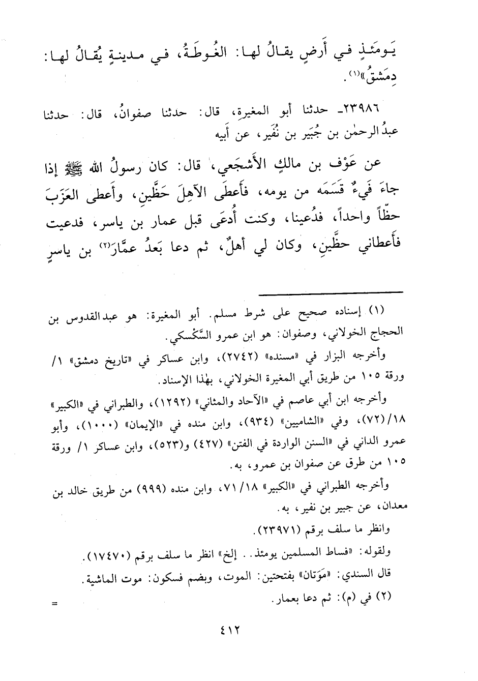٢٣٩٨٦ - حَدَّثَنَا أَبُو الْمُغِيرَةِ قَالَ: حَدَّثَنَا صَفْوَانُ قَالَ: حَدَّثَنَا عَبْدُ الرَّحْمَنِ بْنُ جُبَيْرِ بْنِ نُفَيْرٍ، عَنْ أَبِيهِ، عَنْ عَوْفِ بْنِ مَالِكٍ الْأَشْجَعِيِّ قَالَ: كَانَ رَسُولُ اللهِ صَلَّى اللهُ عَلَيْهِ وَسَلَّمَ إِذَا جَاءَ فَيْءٌ قَسَمَهُ مِنْ يَوْمِهِ، فَأَعْطَى الْآهِلَ حَظَّيْنِ، وَأَعْطَى الْعَزَبَ حَظًّا وَاحِدًا. فَدُعِينَا وَكُنْتُ أُدْعَى قَبْلَ عَمَّارِ (٢) بْنِ يَاسِرٍ،