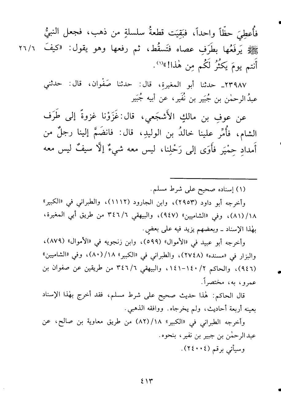 ٢٣٩٨٧ - حَدَّثَنَا أَبُو الْمُغِيرَةِ قَالَ: حَدَّثَنَا صَفْوَانُ قَالَ: حَدَّثَنِي عَبْدُ الرَّحْمَنِ بْنُ جُبَيْرِ بْنِ نُفَيْرٍ، عَنْ أَبِيهِ جُبَيْرٍ، عَنْ عَوْفِ بْنِ مَالِكٍ الْأَشْجَعِيِّ قَالَ: غَزَوْنَا غَزْوَةً إِلَى طَرَفِ الشَّامِ، فَأُمِّرَ عَلَيْنَا خَالِدُ بْنُ الْوَلِيدِ، قَالَ: فَانْضَمَّ إِلَيْنَا رَجُلٌ مِنْ أَمْدَادِ حِمْيَرَ، فَأَوَى إِلَى رَحْلِنَا لَيْسَ مَعَهُ شَيْءٌ إِلَّا سَيْفٌ، لَيْسَ مَعَهُ