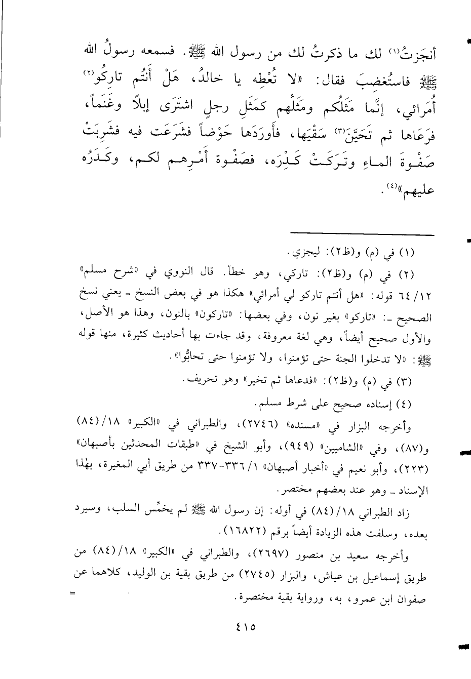 أَنْجَزْتُ (١) لَكَ مَا ذَكَرْتُ لَكَ مِنْ رَسُولِ اللهِ صَلَّى اللهُ عَلَيْهِ وَسَلَّمَ، فَسَمِعَهُ رَسُولُ اللهِ صَلَّى اللهُ عَلَيْهِ وَسَلَّمَ فَاسْتُغْضِبَ، فَقَالَ: " لَا تُعْطِهِ يَا خَالِدُ، هَلْ أَنْتُمْ تَارِكُو (٢) أُمَرَائِي؟ إِنَّمَا مَثَلُكُمْ وَمَثَلُهُمْ كَمَثَلِ رَجُلٍ اشْتَرَى إِبِلًا، وَغَنَمًا فَرَعَاهَا، ثُمَّ تَحَيَّنَ (٣) سَقْيَهَا فَأَوْرَدَهَا حَوْضًا، فَشَرَعَتْ فِيهِ، فَشَرِبَتْ صَفْوَةَ الْمَاءِ، وَتَرَكَتْ كَدَرَهُ، فَصَفْوُهُ أَمْرُهُمْ لَكُمْ وَكَدَرُهُ عَلَيْهِمْ " (٤)