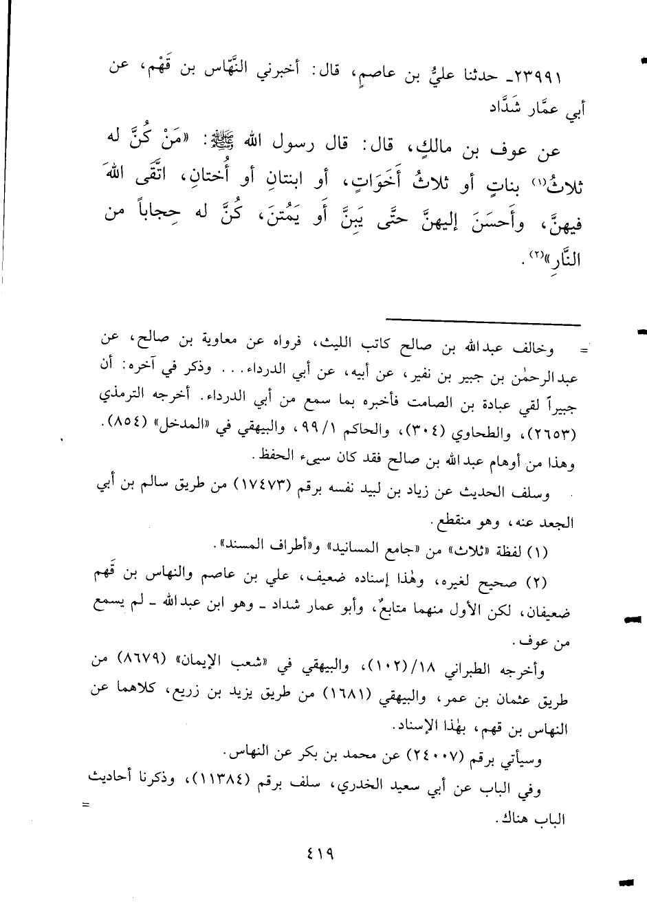 ٢٣٩٩١ - حَدَّثَنَا عَلِيُّ بْنُ عَاصِمٍ قَالَ: أَخْبَرَنِي النَّهَّاسُ بْنُ قَهْمٍ، عَنْ أَبِي عَمَّارٍ شَدَّادٍ، عَنْ عَوْفِ بْنِ مَالِكٍ قَالَ: قَالَ رَسُولُ اللهِ صَلَّى اللهُ عَلَيْهِ وَسَلَّمَ: " مَنْ كُنَّ لَهُ ثَلَاثُ (١) بَنَاتٍ أَوْ ثَلَاثُ أَخَوَاتٍ، أَوْ بِنْتَانِ أَوْ أُخْتَانِ، اتَّقَى اللهَ فِيهِنَّ، وَأَحْسَنَ إِلَيْهِنَّ حَتَّى يَبِنَّ أَوْ يَمُتْنَ، كُنَّ لَهُ حِجَابًا مِنَ النَّارِ " (٢)