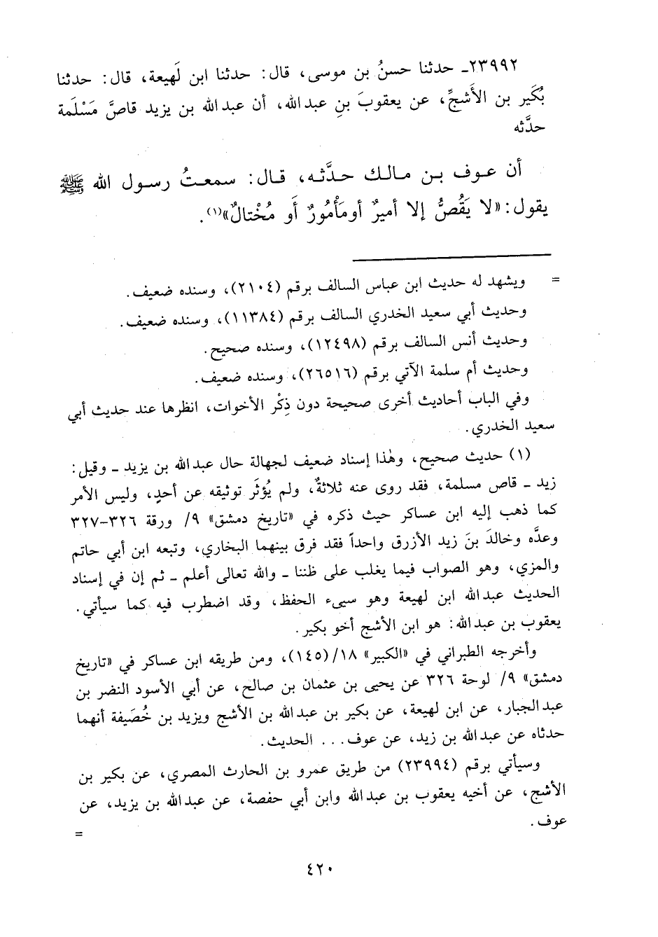 ٢٣٩٩٢ - حَدَّثَنَا حَسَنُ بْنُ مُوسَى قَالَ: حَدَّثَنَا ابْنُ لَهِيعَةَ قَالَ: حَدَّثَنَا بُكَيْرُ بْنُ الْأَشَجِّ، عَنْ يَعْقُوبَ بْنِ عَبْدِ اللهِ، أَنَّ عَبْدَ اللهِ بْنَ يَزِيدَ قَاصَّ مَسْلَمَةَ حَدَّثَهُ، أَنَّ عَوْفَ بْنَ مَالِكٍ حَدَّثَهُ قَالَ: سَمِعْتُ رَسُولَ اللهِ صَلَّى اللهُ عَلَيْهِ وَسَلَّمَ يَقُولُ: " لَا يَقُصُّ إِلَّا أَمِيرٌ أَوْ مَأْمُورٌ أَوْ مُخْتَالٌ " (١)