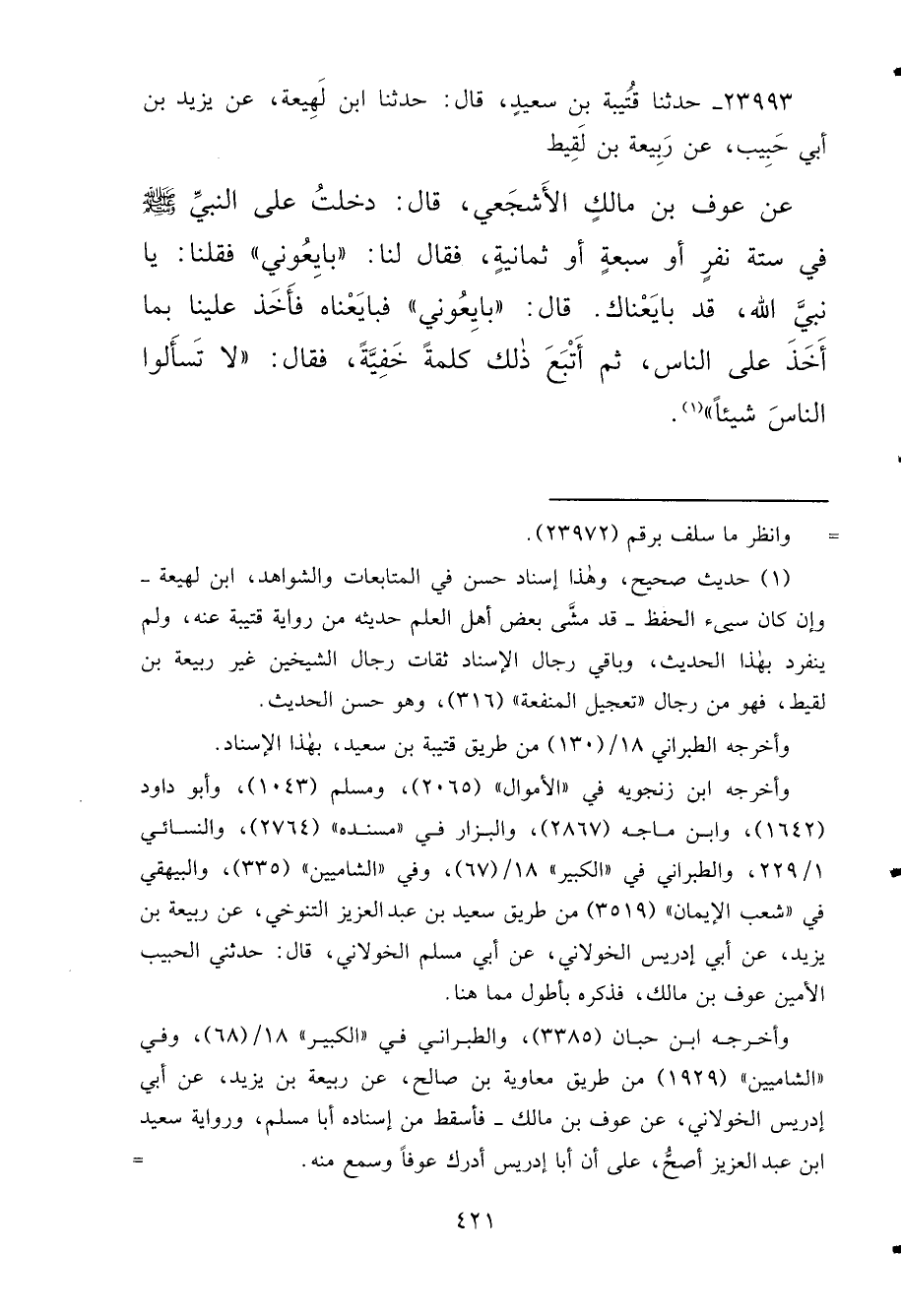 ٢٣٩٩٣ - حَدَّثَنَا قُتَيْبَةُ بْنُ سَعِيدٍ قَالَ: حَدَّثَنَا ابْنُ لَهِيعَةَ، عَنْ يَزِيدَ بْنِ أَبِي حَبِيبٍ، عَنْ رَبِيعَةَ بْنِ لَقِيطٍ، عَنْ عَوْفِ بْنِ مَالِكٍ الْأَشْجَعِيِّ قَالَ: دَخَلْتُ عَلَى النَّبِيِّ صَلَّى اللهُ عَلَيْهِ وَسَلَّمَ فِي سِتَّةِ نَفَرٍ أَوْ سَبْعَةٍ أَوْ ثَمَانِيَةٍ، فَقَالَ لَنَا: " بَايِعُونِي " فَقُلْنَا: يَا نَبِيَّ اللهِ قَدْ بَايَعْنَاكَ، قَالَ: " بَايِعُونِي " فَبَايَعْنَاهُ فَأَخَذَ عَلَيْنَا بِمَا أَخَذَ عَلَى النَّاسِ، ثُمَّ أَتْبَعَ ذَلِكَ كَلِمَةً خَفِيَّةً، فَقَالَ: " لَا تَسْأَلُوا النَّاسَ شَيْئًا " (١)