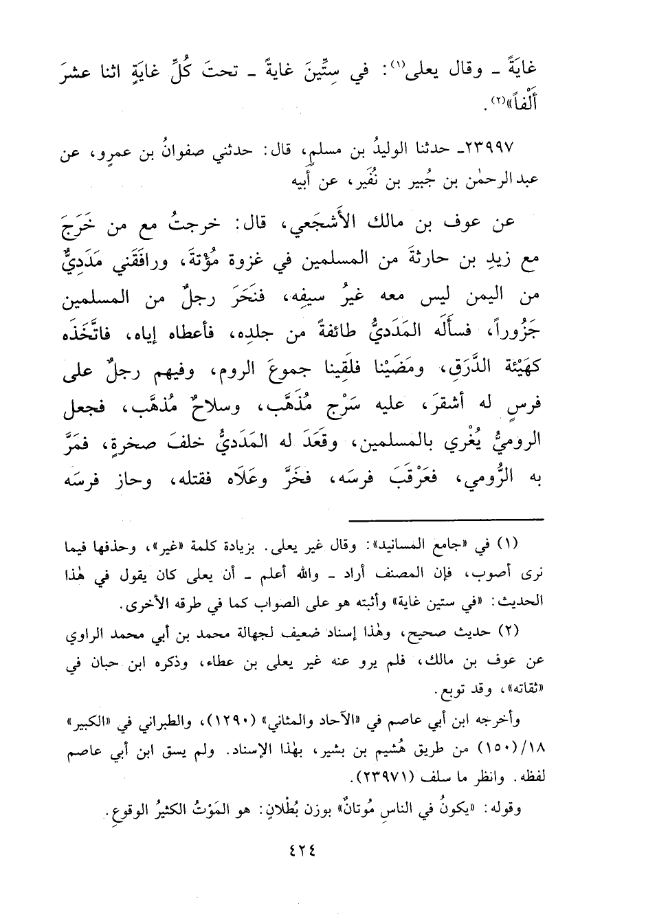 ٢٣٩٩٧ - حَدَّثَنَا الْوَلِيدُ بْنُ مُسْلِمٍ قَالَ: حَدَّثَنِي صَفْوَانُ بْنُ عَمْرٍو، عَنْ عَبْدِ الرَّحْمَنِ بْنِ جُبَيْرِ بْنِ نُفَيْرٍ، عَنْ أَبِيهِ، عَنْ عَوْفِ بْنِ مَالِكٍ الْأَشْجَعِيِّ قَالَ: خَرَجْتُ مَعَ مَنْ خَرَجَ مَعَ زَيْدِ بْنِ حَارِثَةَ مِنَ الْمُسْلِمِينَ فِي غَزْوَةِ مُؤْتَةَ، وَرَافَقَنِي مَدَدِيٌّ مِنَ الْيَمَنِ، لَيْسَ مَعَهُ غَيْرُ سَيْفِهِ، فَنَحَرَ رَجُلٌ مِنَ الْمُسْلِمِينَ جَزُورًا، فَسَأَلَهُ الْمَدَدِيُّ طَائِفَةً مِنْ جِلْدِهِ، فَأَعْطَاهُ إِيَّاهُ، فَاتَّخَذَهُ كَهَيْئَةِ الدَّرَقِ، وَمَضَيْنَا، فَلَقِينَا جُمُوعَ الرُّومِ، وَفِيهِمْ رَجُلٌ عَلَى فَرَسٍ لَهُ أَشْقَرَ عَلَيْهِ سَرْجٌ مُذَهَّبٌ، وَسِلَاحٌ مُذَهَّبٌ، فَجَعَلَ الرُّومِيُّ يُغْرِي بِالْمُسْلِمِينَ، وَقَعَدَ لَهُ الْمَدَدِيُّ خَلْفَ صَخْرَةٍ، فَمَرَّ بِهِ الرُّومِيُّ فَعَرْقَبَ فَرَسَهُ، فَخَرَّ وَعَلَاهُ فَقَتَلَهُ، وَحَازَ فَرَسَهُ