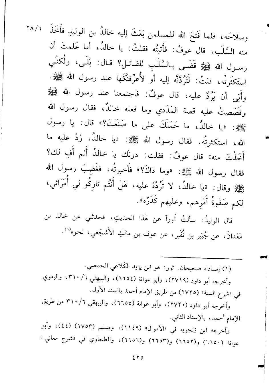 وَسِلَاحَهُ، فَلَمَّا فَتَحَ اللهُ لِلْمُسْلِمِينَ، بَعَثَ إِلَيْهِ خَالِدُ بْنُ الْوَلِيدِ، فَأَخَذَ مِنْهُ السَّلَبَ، قَالَ عَوْفٌ: فَأَتَيْتُهُ، فَقُلْتُ: يَا خَالِدُ، أَمَا عَلِمْتَ أَنَّ رَسُولَ اللهِ صَلَّى اللهُ عَلَيْهِ وَسَلَّمَ قَضَى بِالسَّلَبِ لِلْقَاتِلِ. قَالَ: بَلَى، وَلَكِنِّي اسْتَكْثَرْتُهُ، قُلْتُ: لَتَرُدَّنَّهُ إِلَيْهِ أَوْ لَأُعَرِّفَنَّكَهَا عِنْدَ رَسُولِ اللهِ صَلَّى اللهُ عَلَيْهِ وَسَلَّمَ، وَأَبَى أَنْ يَرُدَّ عَلَيْهِ. قَالَ عَوْفٌ: فَاجْتَمَعَا عِنْدَ رَسُولِ اللهِ صَلَّى اللهُ عَلَيْهِ وَسَلَّمَ وَقَصَصْتُ عَلَيْهِ قِصَّةَ الْمَدَدِيِّ، وَمَا فَعَلَهُ خَالِدٌ فَقَالَ رَسُولُ اللهِ صَلَّى اللهُ عَلَيْهِ وَسَلَّمَ: " يَا خَالِدُ، مَا حَمَلَكَ عَلَى مَا صَنَعْتَ؟ " قَالَ: يَا رَسُولَ اللهِ صَلَّى اللهُ عَلَيْهِ وَسَلَّمَ، اسْتَكْثَرْتُهُ، فَقَالَ رَسُولُ اللهِ صَلَّى اللهُ عَلَيْهِ وَسَلَّمَ: " يَا خَالِدُ، رُدَّ عَلَيْهِ مَا أَخَذْتَ مِنْهُ ". قَالَ عَوْفٌ: فَقُلْتُ: دُونَكَ يَا خَالِدُ، أَلَمْ أَفِ لَكَ؟ فَقَالَ رَسُولُ اللهِ صَلَّى اللهُ عَلَيْهِ وَسَلَّمَ: " وَمَا ذَاكَ؟ "، فَأَخْبَرْتُهُ، فَغَضِبَ رَسُولُ اللهِ صَلَّى اللهُ عَلَيْهِ وَسَلَّمَ وَقَالَ: " يَا خَالِدُ، لَا تَرُدَّهُ عَلَيْهِ، هَلْ أَنْتُمْ تَارِكُو لِيَّ أُمَرَائِي لَكُمْ صَفْوَةُ أَمْرِهِمْ، وَعَلَيْهِمْ كَدَرُهُ؟ " قَالَ الْوَلِيدُ: سَأَلْتُ ثَوْرًا عَنْ هَذَا الْحَدِيثِ؟ فَحَدَّثَنِي عَنْ خَالِدِ بْنِ مَعْدَانَ، عَنْ جُبَيْرِ بْنِ نُفَيْرٍ، عَنْ عَوْفِ بْنِ مَالِكٍ الْأَشْجَعِيِّ نَحْوَهُ (١)