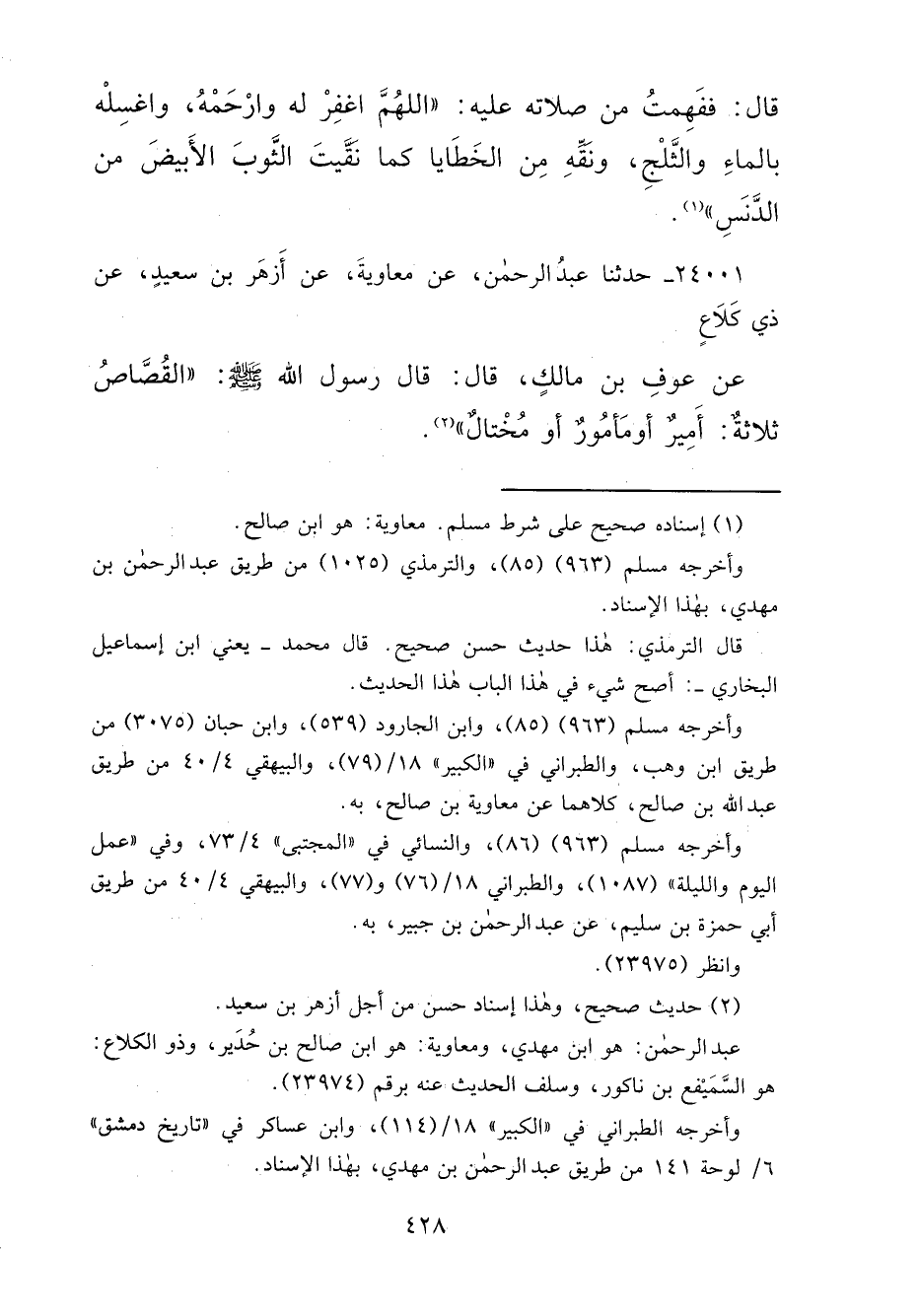 ٢٤٠٠١ - حَدَّثَنَا عَبْدُ الرَّحْمَنِ، عَنْ مُعَاوِيَةَ، عَنْ أَزْهَرَ بْنِ سَعِيدٍ، عَنْ ذِي كَلَاعٍ، عَنْ عَوْفِ بْنِ مَالِكٍ قَالَ: قَالَ رَسُولُ اللهِ صَلَّى اللهُ عَلَيْهِ وَسَلَّمَ: " الْقُصَّاصُ ثَلَاثَةٌ: أَمِيرٌ، أَوْ مَأْمُورٌ، أَوْ مُخْتَالٌ " (٢)