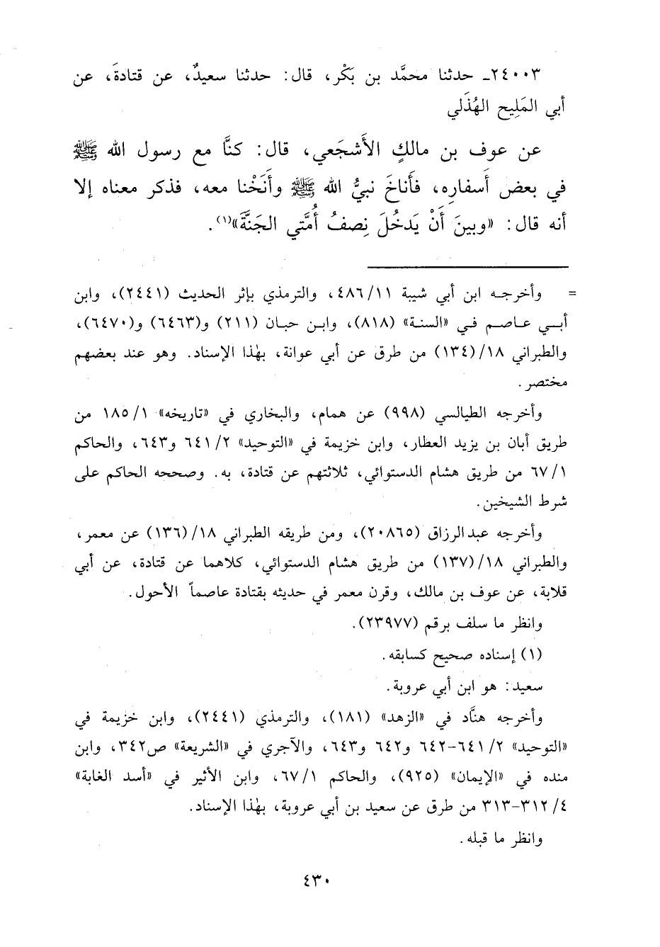 ٢٤٠٠٣ - حَدَّثَنَا مُحَمَّدُ بْنُ بَكْرٍ قَالَ: حَدَّثَنَا سَعِيدٌ، عَنْ قَتَادَةَ، عَنْ أَبِي الْمَلِيحِ الْهُذَلِيِّ، عَنْ عَوْفِ بْنِ مَالِكٍ الْأَشْجَعِيِّ قَالَ: كُنَّا مَعَ رَسُولِ اللهِ صَلَّى اللهُ عَلَيْهِ وَسَلَّمَ فِي بَعْضِ أَسْفَارِهِ، فَأَنَاخَ نَبِيُّ اللهِ صَلَّى اللهُ عَلَيْهِ وَسَلَّمَ، وَأَنَخْنَا مَعَهُ، فَذَكَرَ مَعْنَاهُ، إِلَّا أَنَّهُ قَالَ: " وَبَيْنَ أَنْ يَدْخُلَ نِصْفُ أُمَّتِي الْجَنَّةَ " (١)