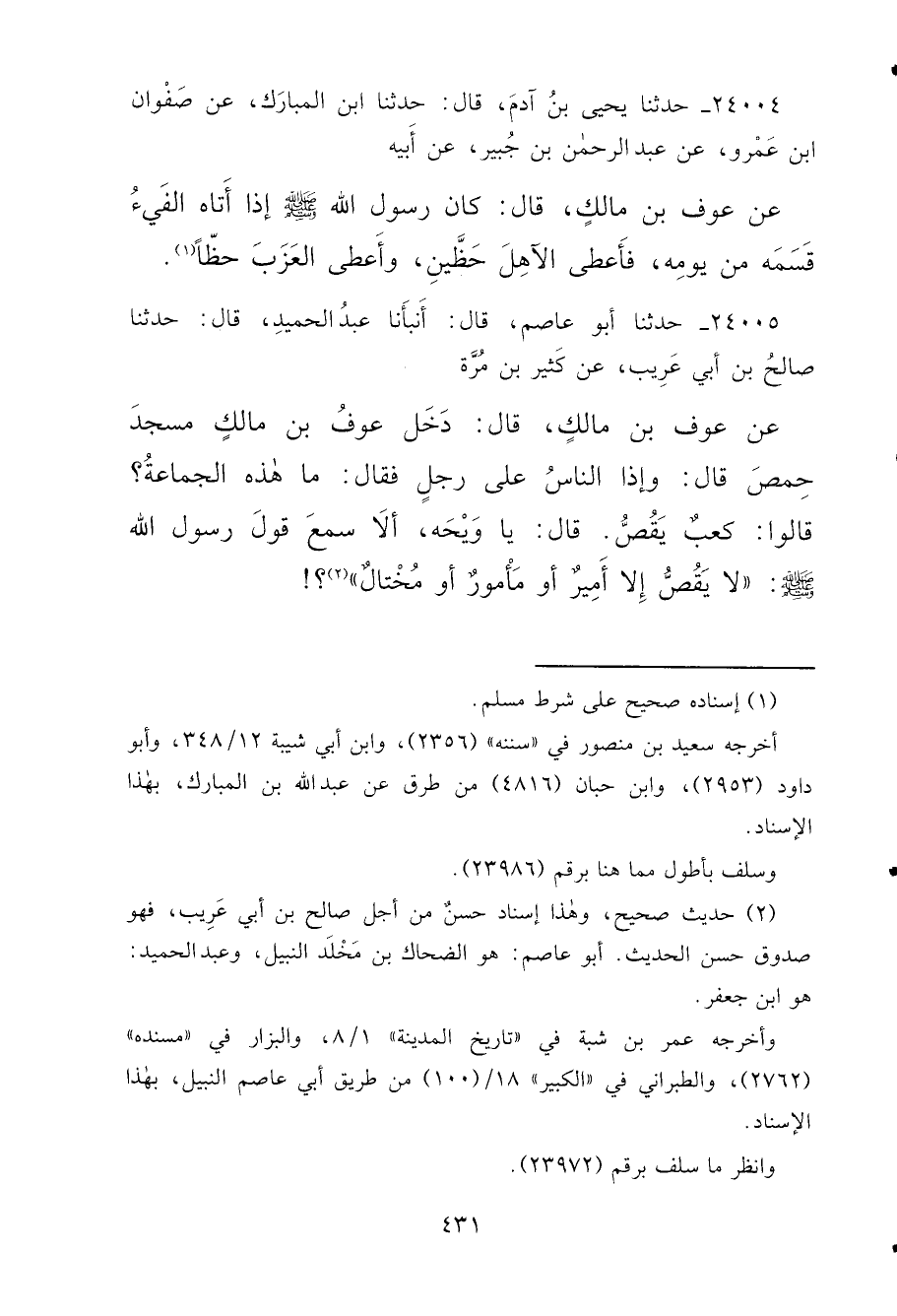 ٢٤٠٠٥ - حَدَّثَنَا أَبُو عَاصِمٍ قَالَ: أَنْبَأَنَا عَبْدُ الْحَمِيدِ قَالَ: حَدَّثَنَا صَالِحُ بْنُ أَبِي عَرِيبٍ، عَنْ كَثِيرِ بْنِ مُرَّةَ، عَنْ عَوْفِ بْنِ مَالِكٍ قَالَ: دَخَلَ عَوْفُ بْنُ مَالِكٍ مَسْجِدَ حِمْصَ قَالَ: وَإِذَا النَّاسُ عَلَى رَجُلٍ، فَقَالَ: مَا هَذِهِ الْجَمَاعَةُ؟ قَالُوا: كَعْبٌ يَقُصُّ، قَالَ: يَا وَيْحَهُ، أَلَا سَمِعَ قَوْلَ رَسُولِ اللهِ صَلَّى اللهُ عَلَيْهِ وَسَلَّمَ " لَا يَقُصُّ إِلَّا أَمِيرٌ أَوْ مَأْمُورٌ أَوْ مُخْتَالٌ " (٢)