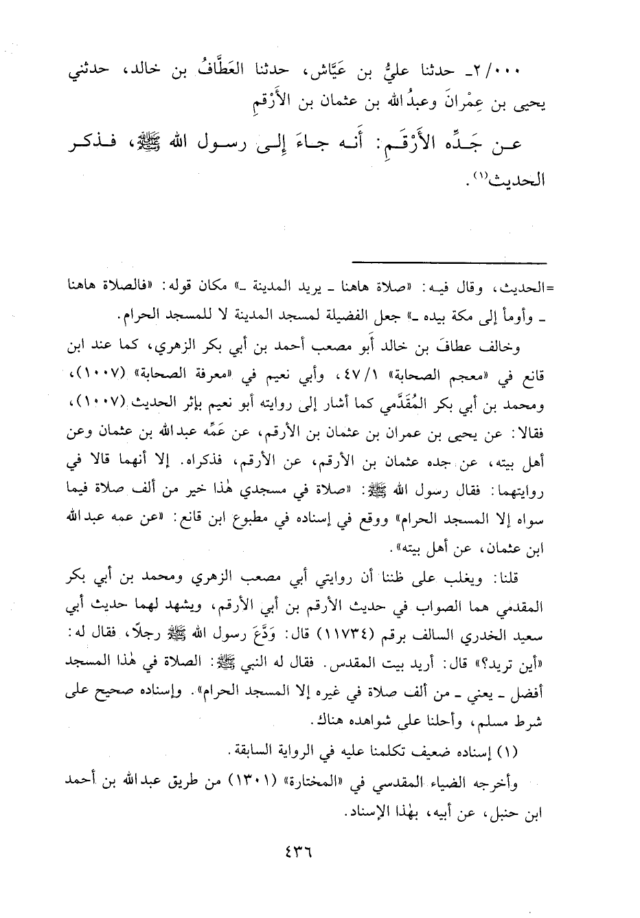 قلناة ويغلب على ظننا أن روايتي أبي مصعب الزهري ومحمد بن أبي بكر المقدمي هما الصواب في حديث الأرقم بن أبي الأرقم، ويشهد لهما حديث أبي سعيد الخدري السالف برقم (١١٧٣٤) قال: وَدَّعَ رسول الله صَلَّى اللهُ عَلَيْهِ وَسَلَّمَ رجلاً، فقال له: "أين تريد؟ " قال: أريد بيت المقدس. فقال له النبي صَلَّى اللهُ عَلَيْهِ وَسَلَّمَ: الصلاة في هذا المسجد أفضل -يعني- من ألف صلاة في غيره إلا المسجد الحرام". وإسناده صحيح على شرط مسلم، وأحلنا على شواهده هناك.