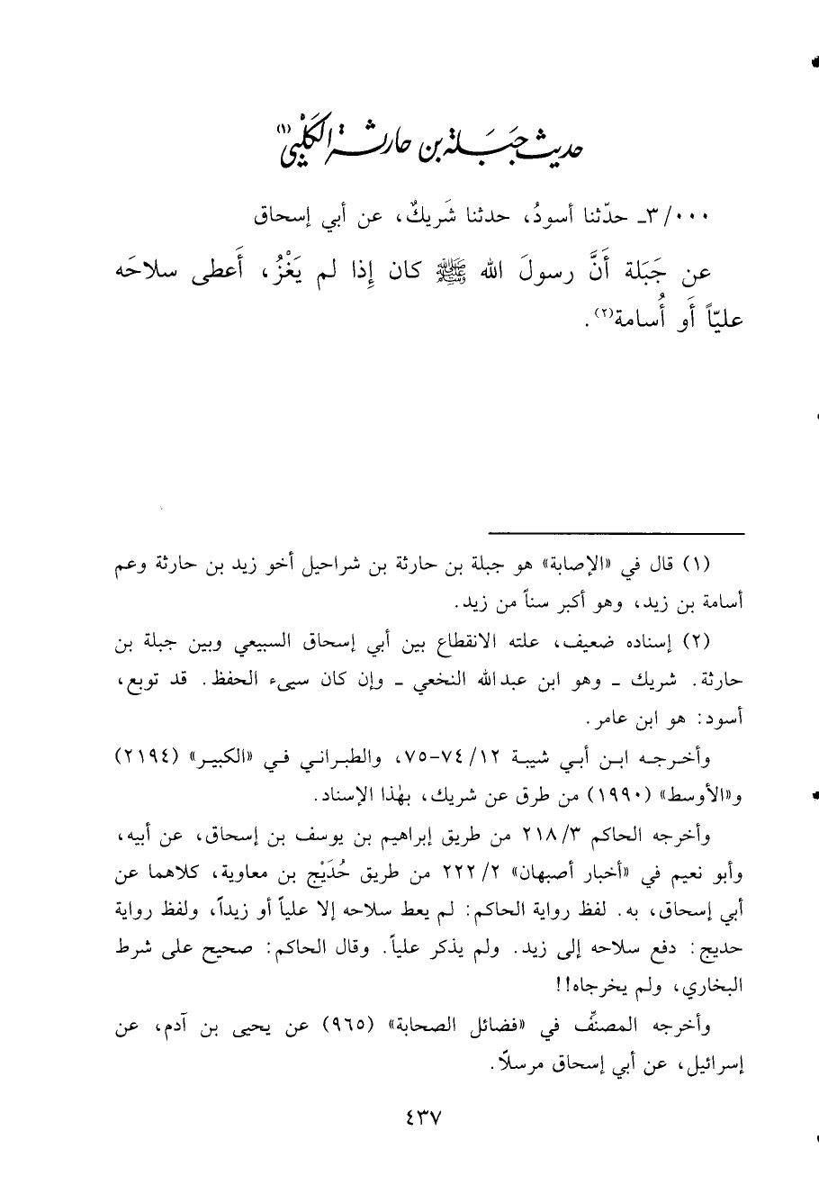 . . . / ٣ - حَدَّثَنَا أَسْوَدُ، حَدَّثَنَا شَرِيكُ، عَنْ أَبِي إِسْحَاقََ، عَنْ جَبَلَةَ: أَنَّ رَسُولَ اللهِ صَلَّى اللهُ عَلَيْهِ وَسَلَّمَ كَانَ إِذَا لَمْ يَغْزُ، أَعْطَى سِلَاحَهُ عَلِيًّا أَوْ أُسَامَةَ " (٢)
