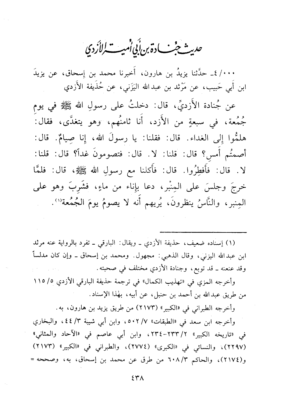 . . . / ٤ - حَدَّثَنَا يَزِيدُ بْنُ هَارُونَ، أَخْبَرَنَا مُحَمَّدُ بْنُ إِسْحَاقَ، عَنْ يَزِيدَ بْنِ أَبِي حَبِيبٍ، عَنْ مَرْثَدِ بْنِ عَبْدِ اللهِ الْيَزَنِيِّ، عَنْ حُذَيْفَةَ الْأَزْدِيِّ، عَنْ جُنَادَةَ الْأَزْدِيِّ، قَالَ: دَخَلْتُ عَلَى رَسُولِ اللهِ صَلَّى اللهُ عَلَيْهِ وَسَلَّمَ فِي يَوْمِ جُمُعَةٍ، فِي سَبْعَةٍ مِنَ الْأَزْدِ، أَنَا ثَامِنُهُمْ، وَهُوَ يَتَغَدَّى، فَقَالَ: " هَلُمُّوا إِلَى الْغَدَاءِ ". قَالَ: فَقُلْنَا: يَا رَسُول الله، إِنَّا صِيَام. قَالَ: " أَصُمْتُم أَمْس؟ " قَالَ: قُلْنَا: لَا. قَالَ: " فَتَصُومُونَ غَدًا "؟ قَالَ: قُلْنَا: لَا. قَالَ: " فَأَفْطِرُوا ". قَالَ: فَأَكَلْنَا مَعَ رَسُولِ اللهِ صَلَّى اللهُ عَلَيْهِ وَسَلَّمَ، قَالَ فَلَمَّا خَرَجَ وَجَلَسَ عَلَى الْمِنْبَرِ، دَعَا بِإِنَاءٍ مِنْ مَاءٍ، فَشَرِبَ وَهُوَ عَلَى الْمِنْبَرِ، وَالنَّاسُ يَنْظُرُونَ، يُرِيَهُمْ أَنَّهُ لَا يَصُومُ يَوْمَ الْجُمُعَةِ (١)