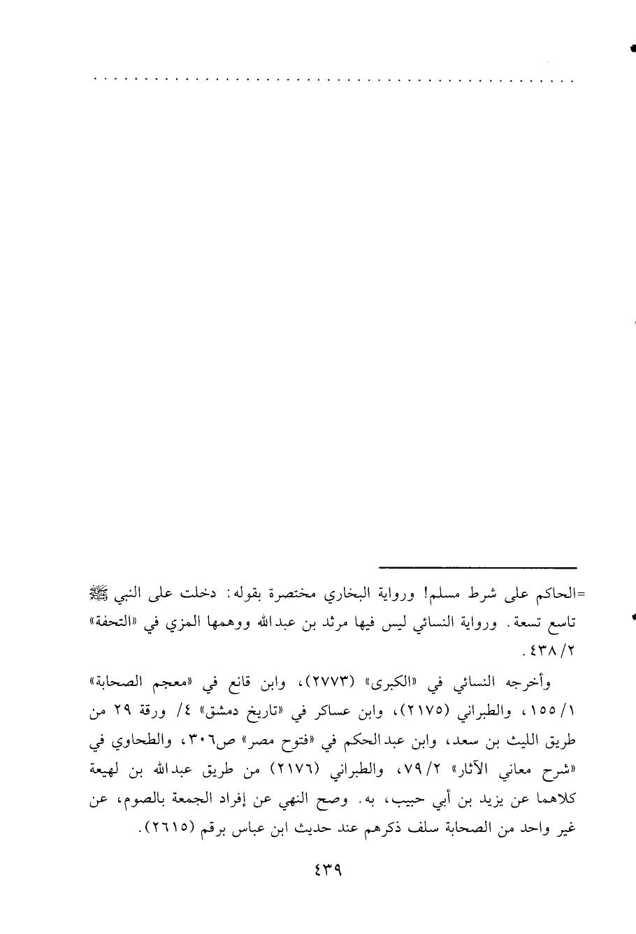 وأخرجه النسائي في "الكبرى" (٢٧٧٣) ، وابن قانع في "معجم الصحابة" ١/١٥٥، والطبراني (٢١٧٥) ، وابن عساكر في "تاريخ دمشق" ٤/ ورقة ٢٩ من طريق الليث بن سعد، وابن عبد الحكم في "فتوح مصر" ص٣٠٦، والطحاوي في "شرح معاني الآثار" ٢/٧٩، والطبراني (٢١٧٦) من طريق عبد الله بن لهيعة كلاهما عن يزيد بن أبي حبيب، به. وصح النهي عن إفراد الجمعة بالصوم، عن غير واحد من الصحابة سلف ذكرهم عند حديث ابن عباس برقم (٢٦١٥) .
