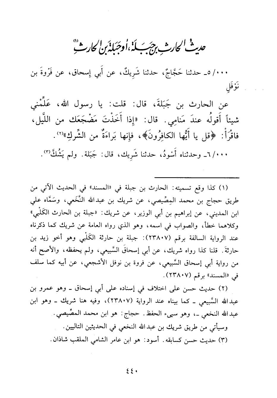 حارثةَ. قلنا كذا رواه شريك، عن أبي إسحاقَ السَّبيعي، ولم يحفظه، والأصح أنه من رواية أبي إسحاق السَّبيعي، عن فروة بن نوفل الأشجعي، عن أبيه كما سلف في "المسند" برقم (٢٣٨٠٧) .