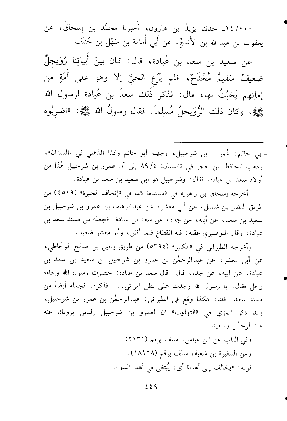 . . / ١٤ - حَدَّثَنَا يَزِيدُ بْنُ هَارُونَ، أَخْبَرَنَا مُحَمَّدُ بْنُ إِسْحَاقَ، عَنْ يَعْقُوبَ بْنِ عَبْدِ اللهِ بْنِ الْأَشَجِّ، عَنْ أَبِي أُمَامَةَ بْنِ سَهْلِ بْنِ حُنَيْفٍ، عَنْ سَعِيدِ بْنِ سَعْدِ بْنِ عُبَادَةَ، قَالَ: كَانَ بَيْنَ أَبْيَاتِنَا رُوَيْجِلٌ ضَعِيفٌ سَقِيمٌ مُخْدَجٌ، فَلَمْ يَرْعَ الْحَيُّ إِلَّا وَهُوَ عَلَى أَمَةٍ مِنْ إِمَائِهِمْ يَخْبُثُ بِهَا، قَالَ فَذَكَرَ ذَلِكَ سَعْدُ بْنُ عُبَادَةَ لِرَسُولِ اللهِ صَلَّى اللهُ عَلَيْهِ وَسَلَّمَ، وَكَانَ ذَلِكَ الرُّوَيْجِلُ مُسْلِمًا. فَقَالَ رَسُولُ الله صَلَّى اللهُ عَلَيْهِ وَسَلَّمَ: " اضْرِبُوهُ
