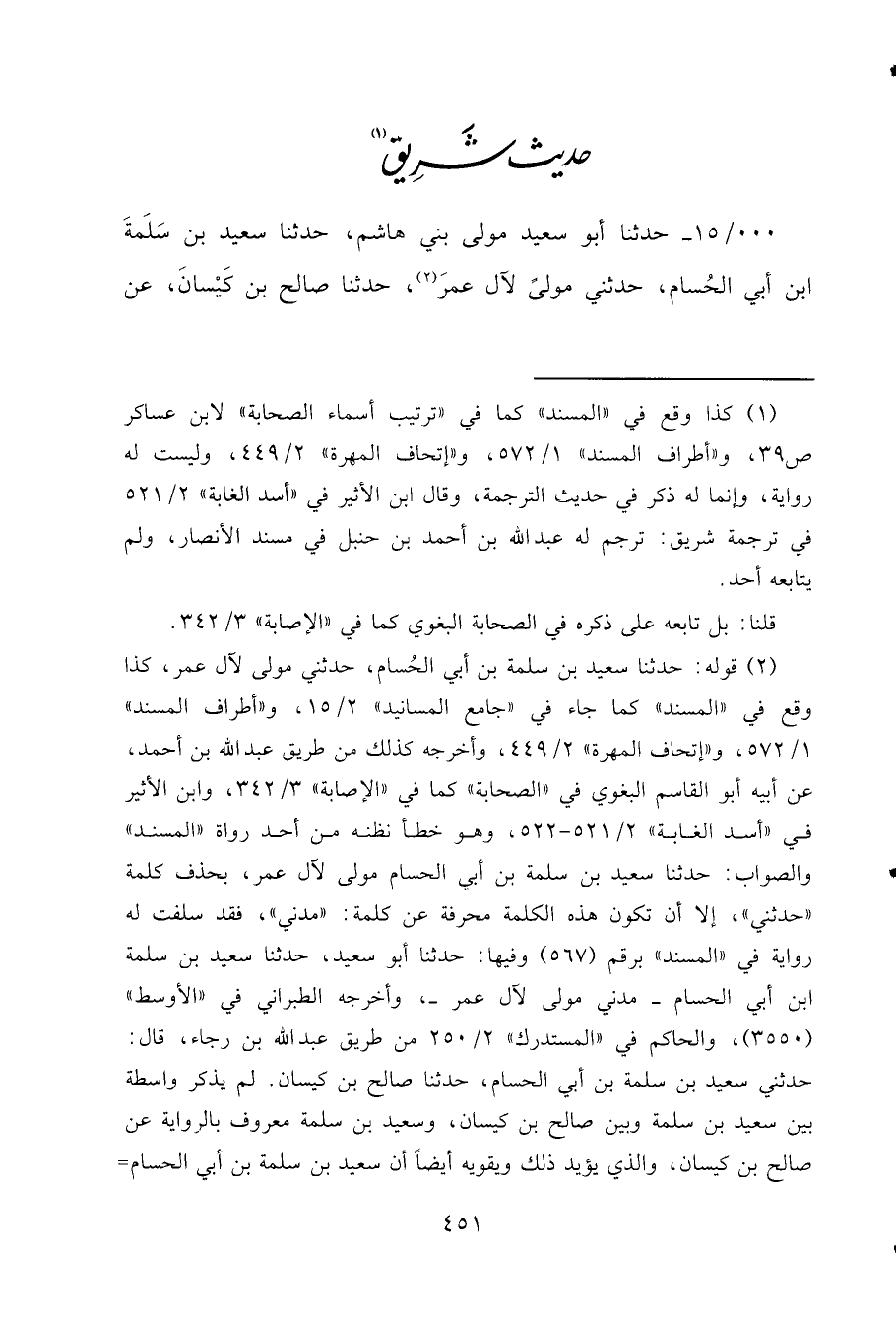 (٢) قوله: حدثنا سعيد بن سلمة بن أبي الحُسام، حدثني مولى لآل عمر، كذا وقع في "المسند" كما جاء في "جامع المسانيد" ٢/١٥، و"أطراف المسند" ١/٥٧٢، و"إتحاف المهرة" ٢/٤٤٩، وأخرجه كذلك من طريق عبد الله بن أحمد، عن أبيه أبو القاسم البغوي في "الصحابة" كما في "الإصابة" ٣/٣٤٢، وابن الأثير في "أسد الغابة" ٢/٥٢١-٥٢٢، وهو خطأ نظنه من أحد رواة "المسند"